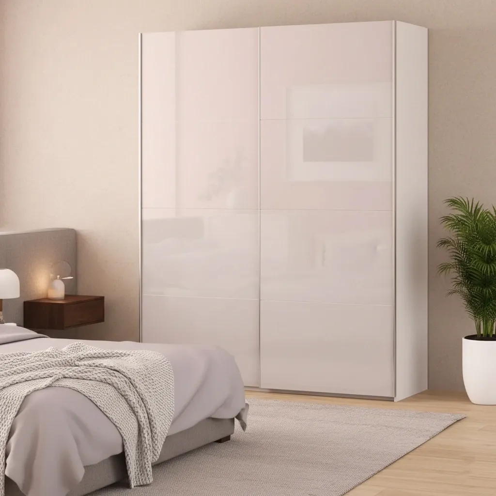 Armadio a 2 ante scorrevoli con elegante decorazione sulle sue 2 ante. All'interno possiede di base ben 4 ripiani fissi e 2 tubi appendiabiti. Ideale per diverse funzioni e disponibile nella versione Bianca oltre che Bianco lucido.