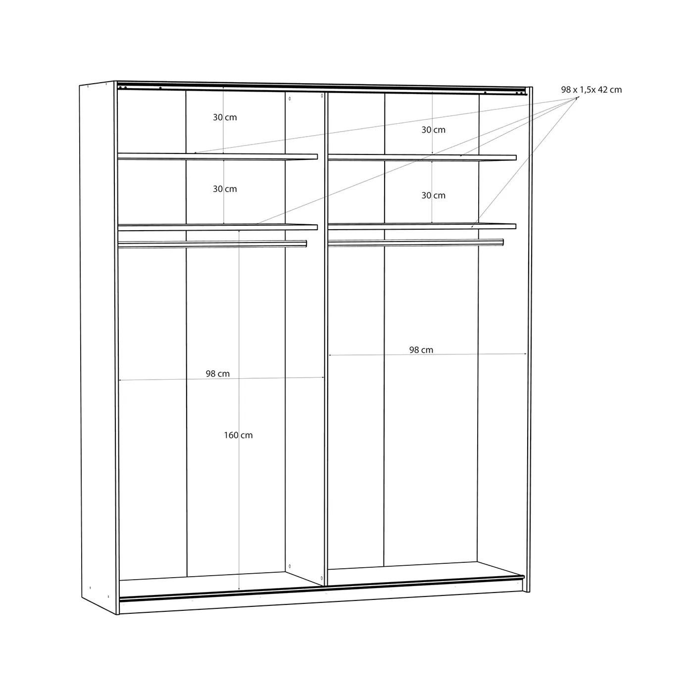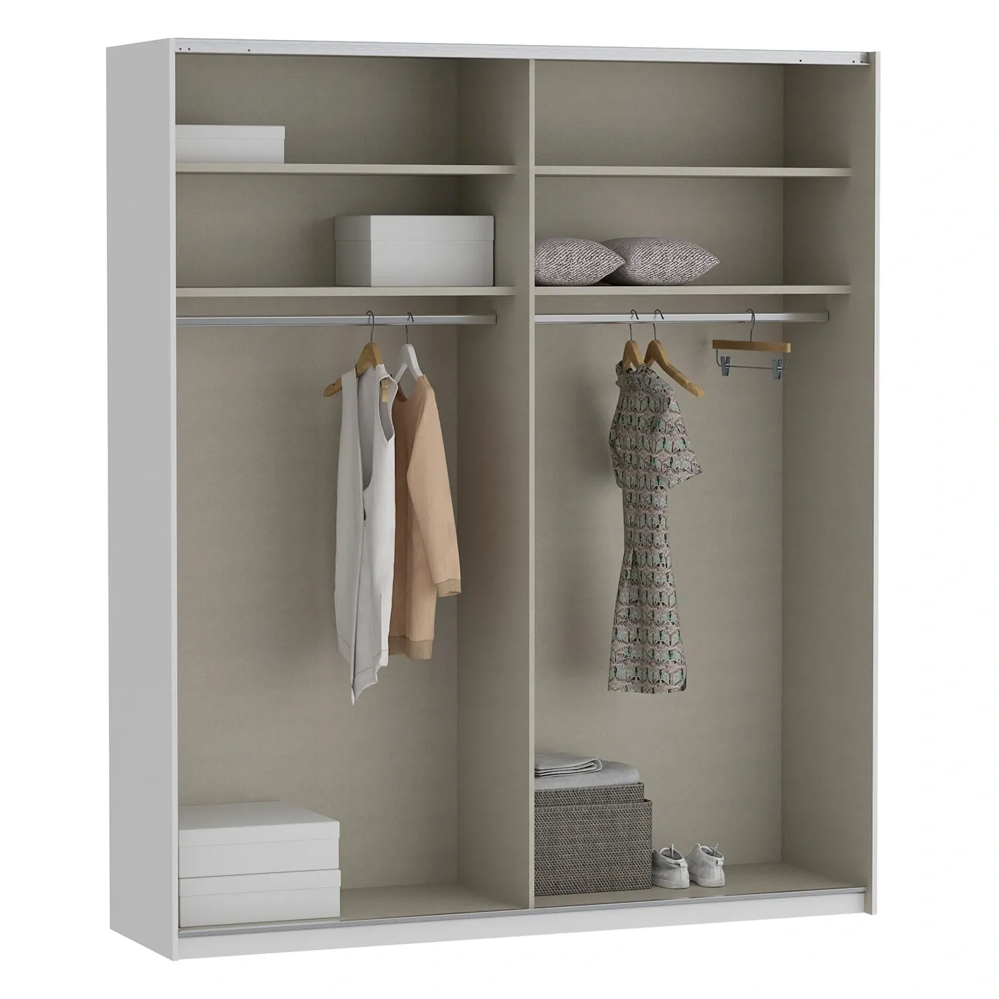 Armadio a 2 ante scorrevoli con elegante decorazione sulle sue 2 ante. All'interno possiede di base ben 4 ripiani fissi e 2 tubi appendiabiti. Ideale per diverse funzioni e disponibile nella versione Bianco lucido oltre che Bianco.