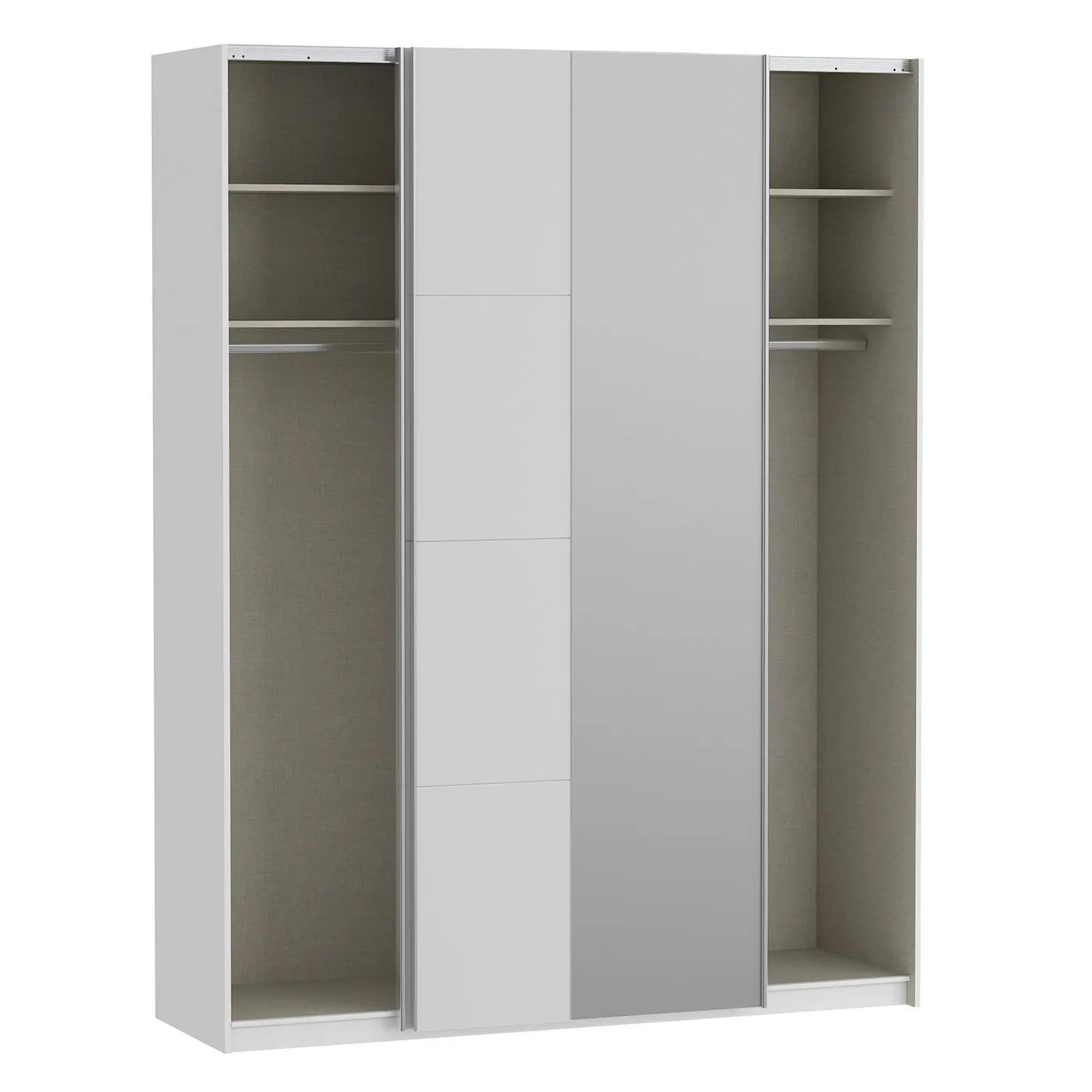 Armadio a 2 ante scorrevoli con elegante decorazione sulle sue 2 ante e uno specchio sopra una di esse. All'interno possiede di base ben 4 ripiani fissi e 2 tubi appendiabiti. Ideale per diverse funzioni e disponibile nella versione Bianco lucido oltre che Bianco.