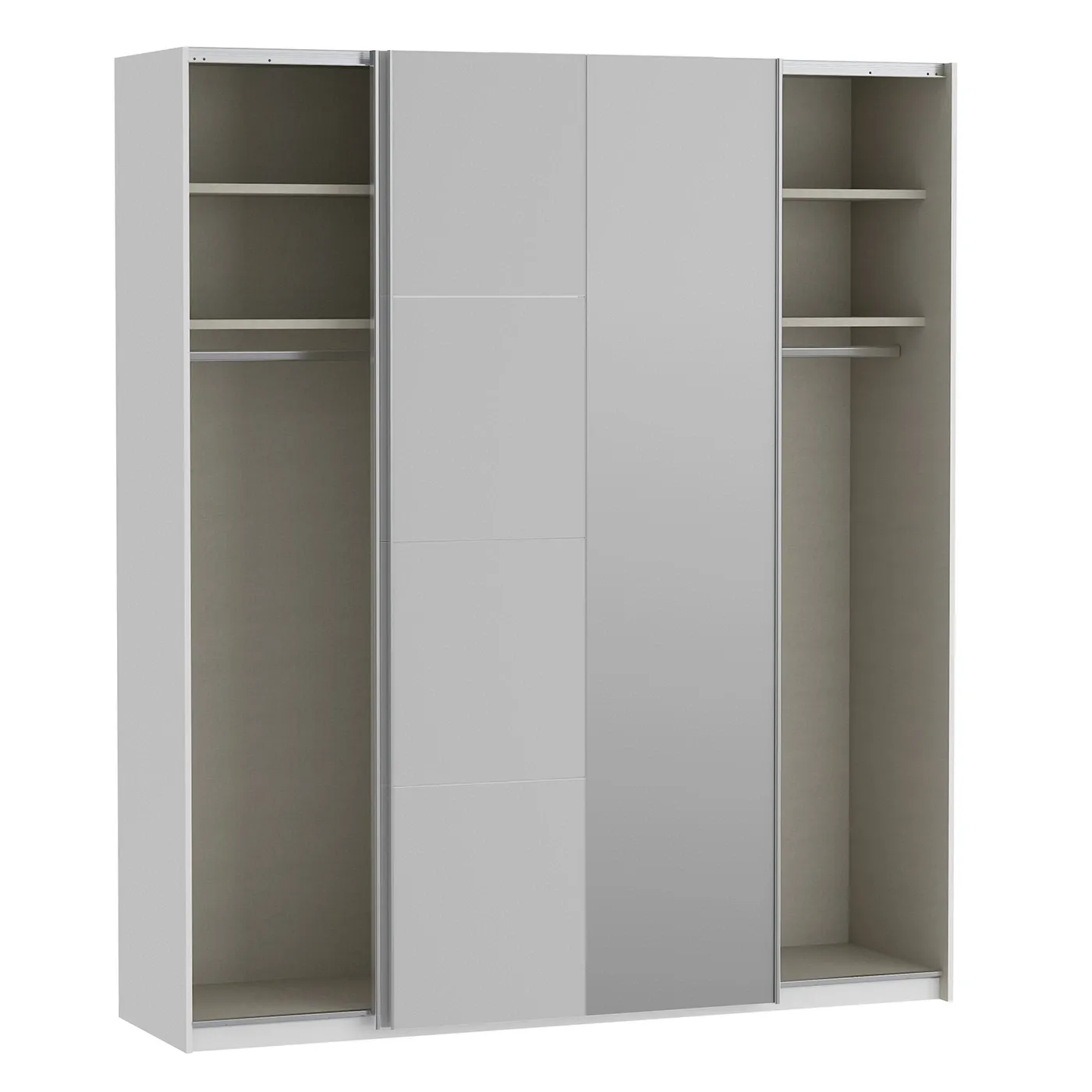 All'interno invece presenta un allestimento altrettanto variegato con 4 ripiani fissi e 2 tubi appendiabiti. Le superfici interni sono di color Grigio, a imitazione del tessuto.