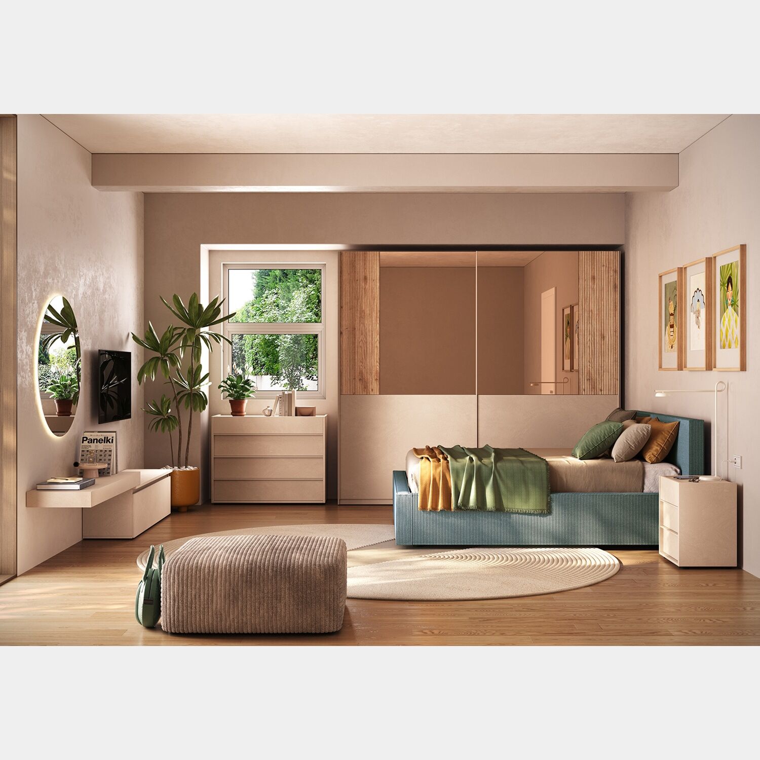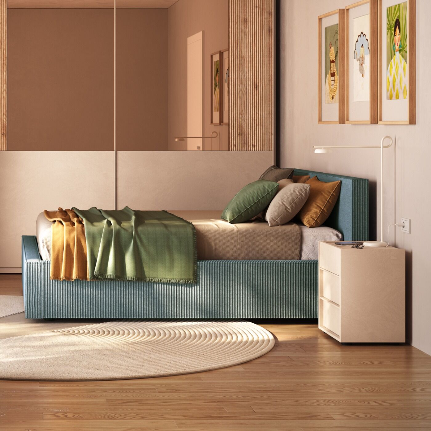 Il letto si trasforma in un pezzo d'arredamento magnetico grazie al velluto a coste color oceano.