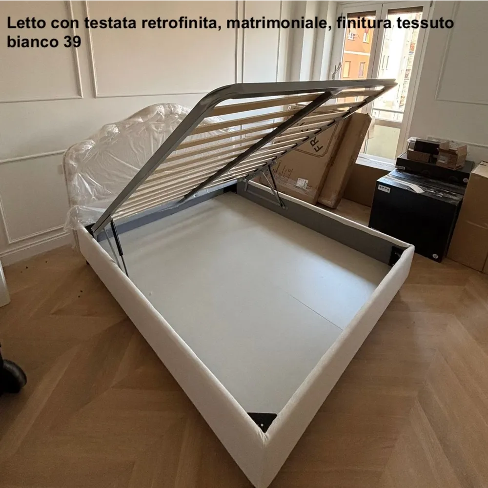 Letto con testata retrofinita, matrimoniale, finitura tessuto panna