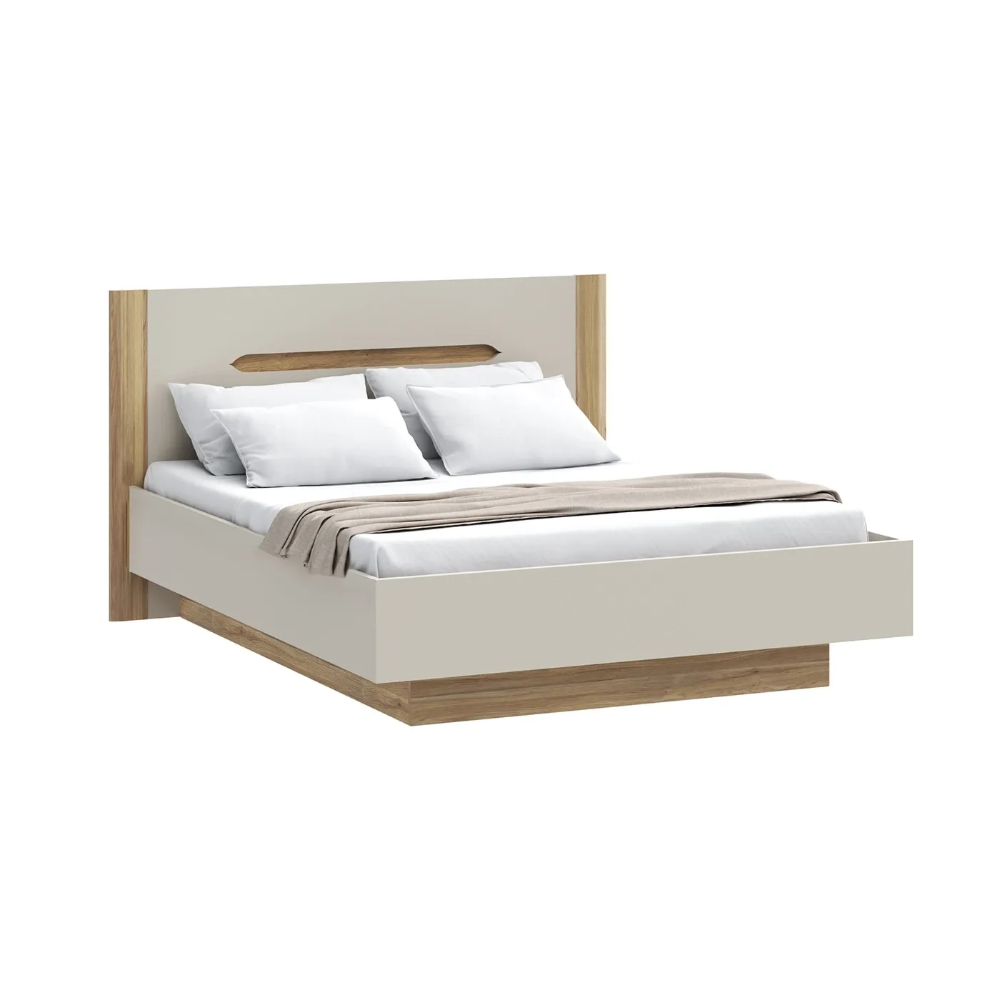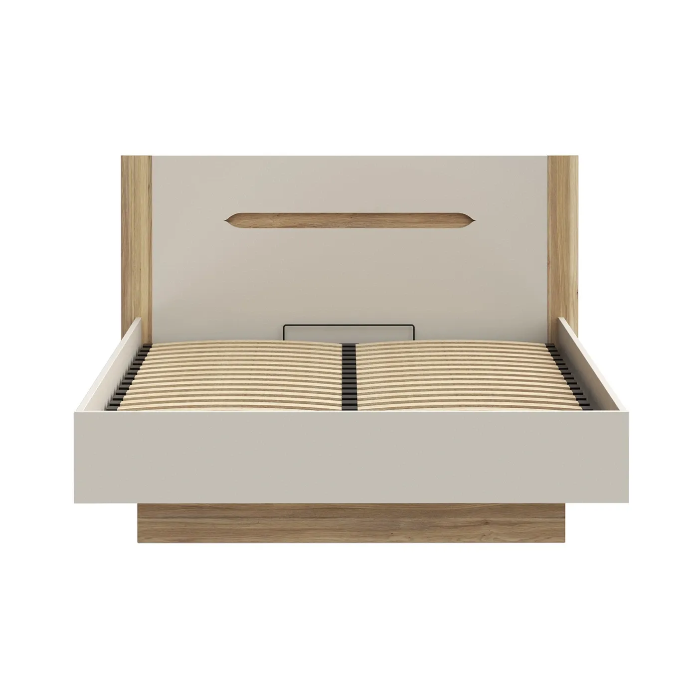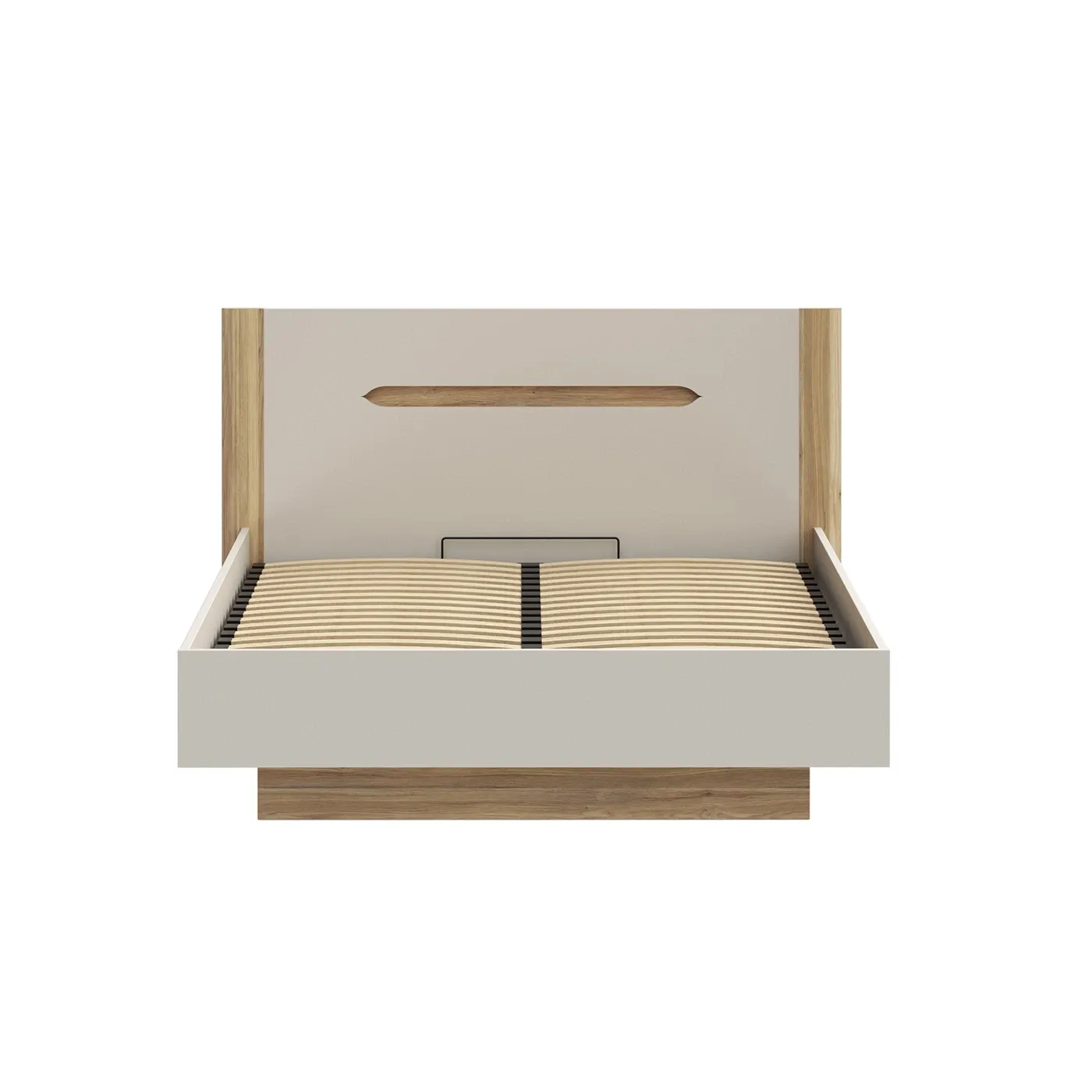 La testiera è l'elemento centrale del design. Presenta un ampio pannello color Sabbia opaco, incorniciato lateralmente da due robusti montanti in finitura Rovere Mauvella con venature verticali. Al centro, una fresatura orizzontale a forma di "asola" rivela il legno sottostante, creando un punto focale geometrico.