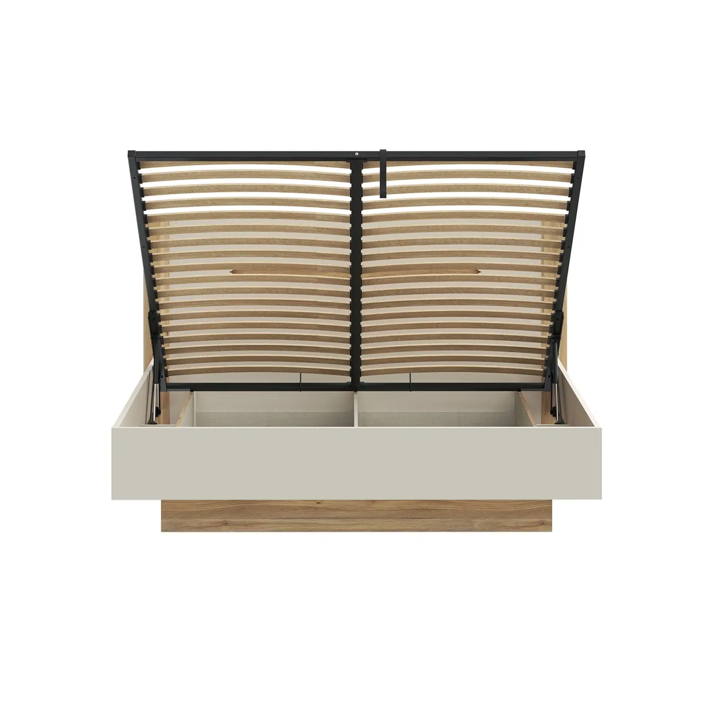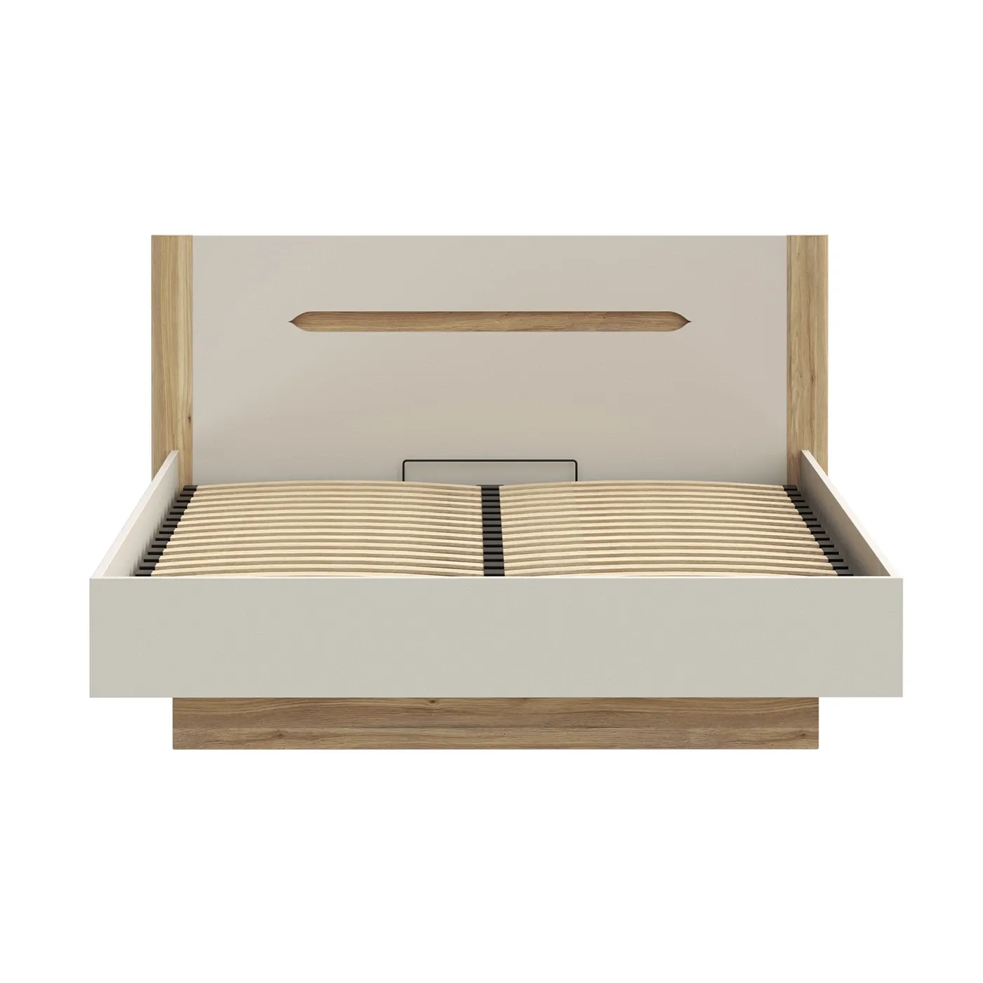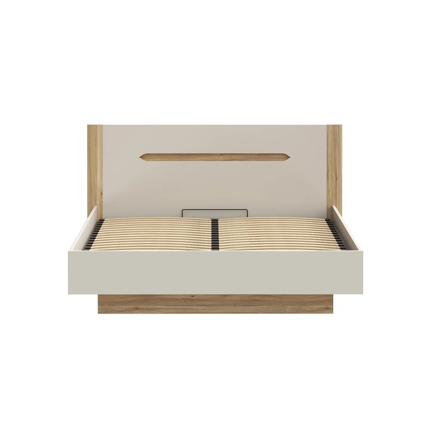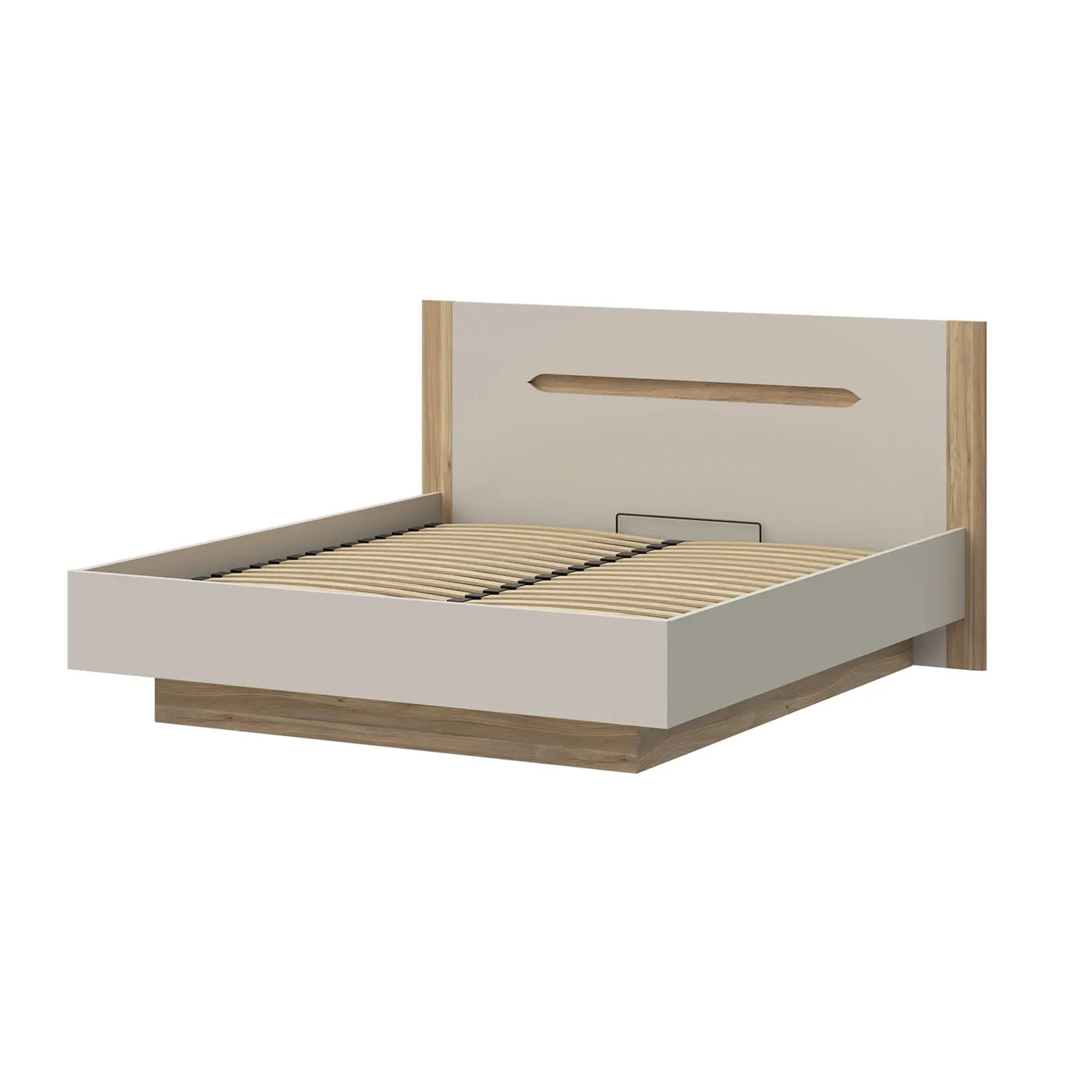 Letto contenitore matrimoniale semi-sospeso dal design moderno e minimale, caratterizzato da un interessante gioco di contrasti tra tonalità neutre e finiture naturali. È una scelta ideale per chi cerca un'estetica pulita ma calda.