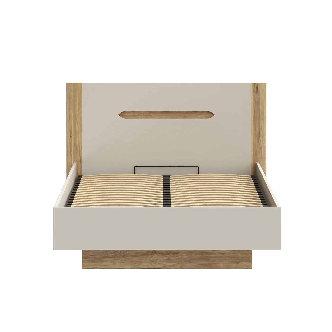 Letto contenitore matrimoniale semi-sospeso per la zona notte, caratterizzato da un design minimalista e una combinazione cromatica naturale e rilassante.