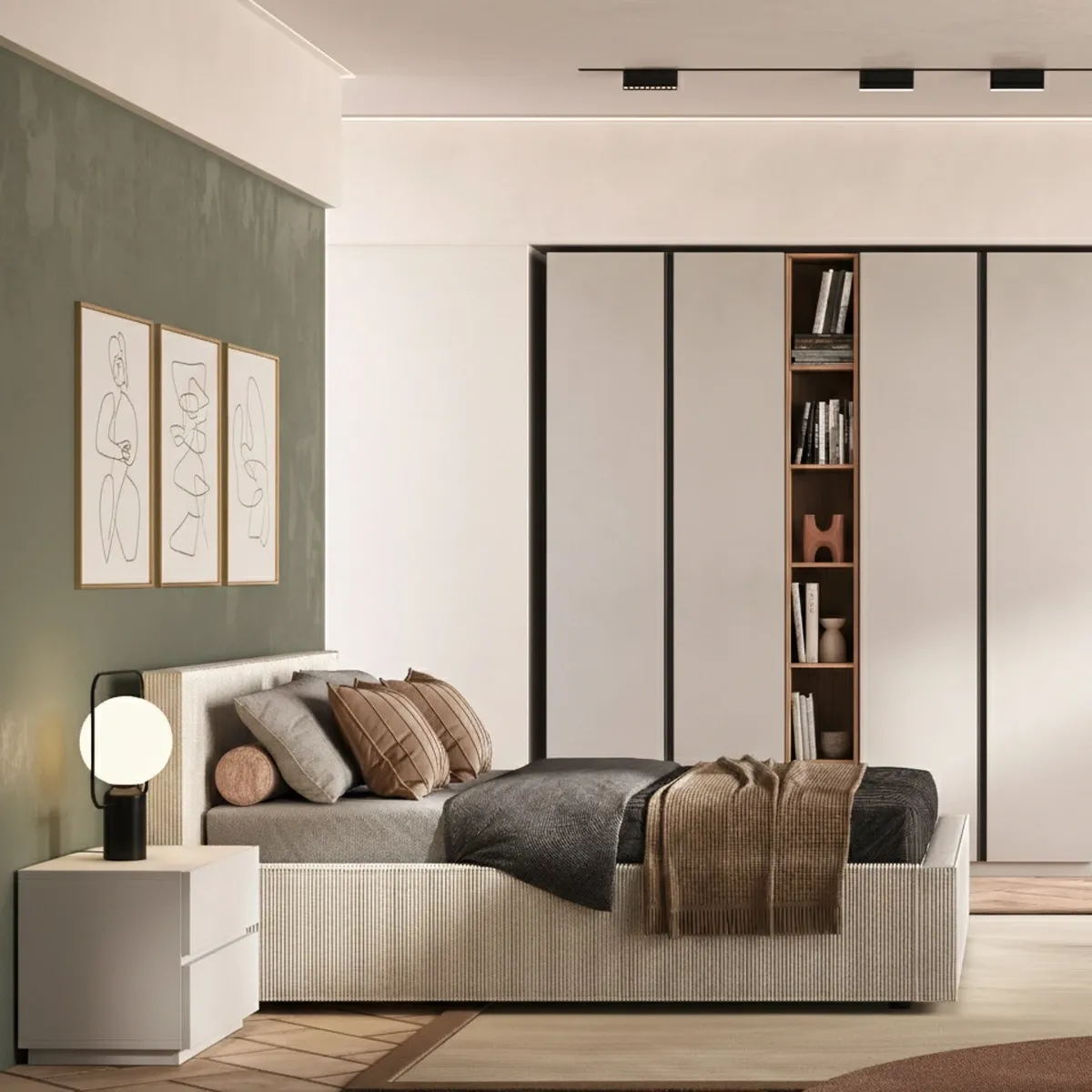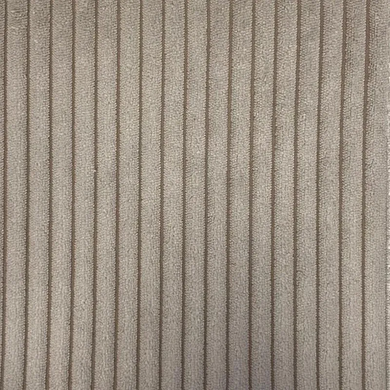 In questa versione, il letto si veste di un raffinato velluto a coste color tortora.