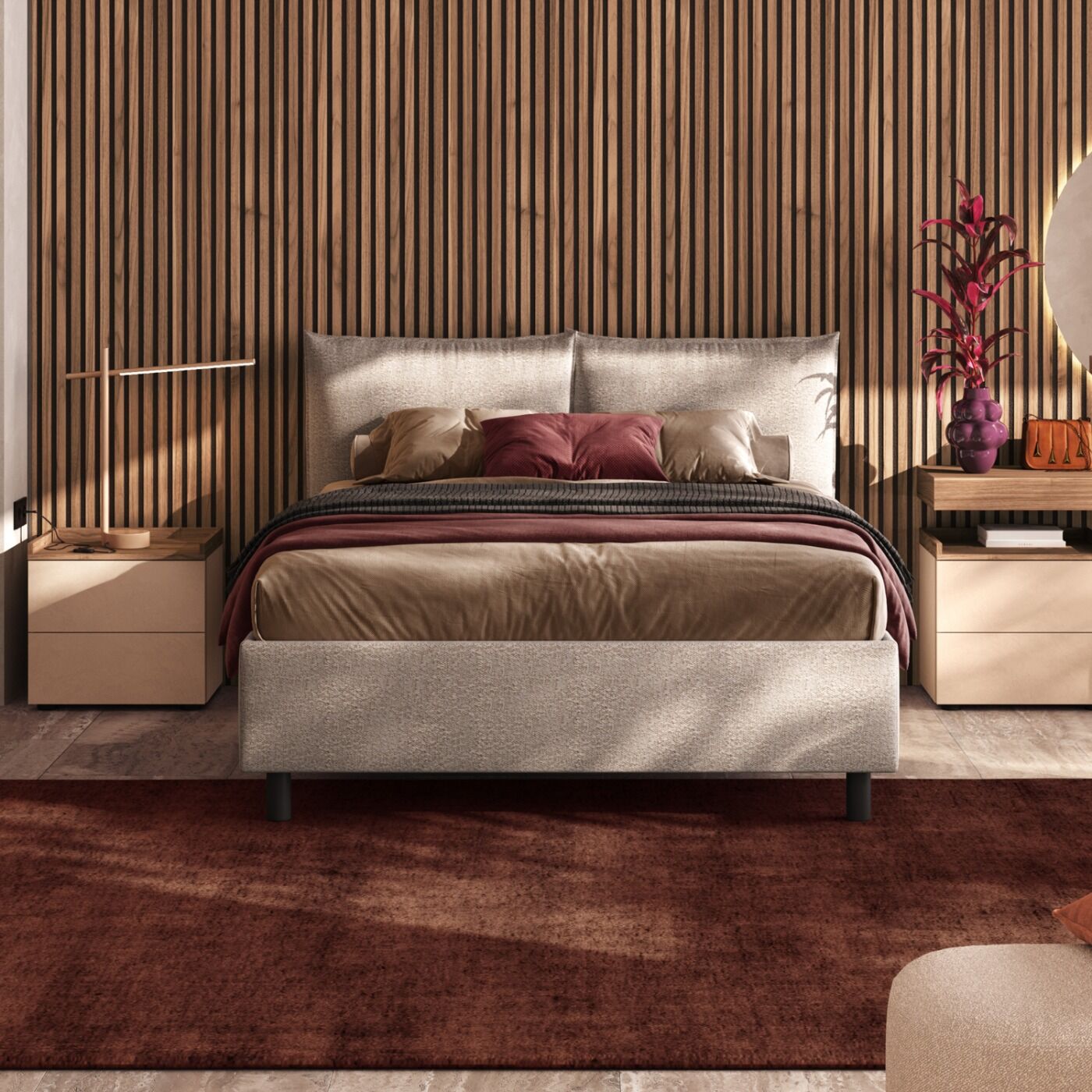 Letto matrimoniale con cuscini, tessuto Bouclè Avorio