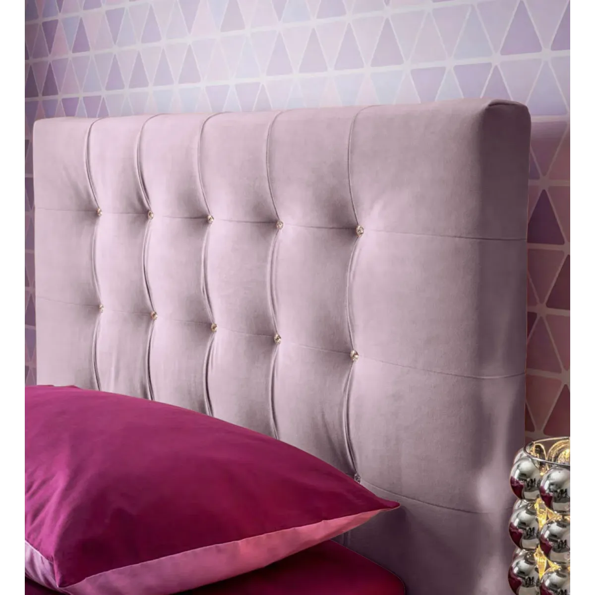 La testata imbottita del letto Britney in tessuto Flamingo Velvet ha una tonalità rosa pastello delicatissima e i bottoni Swarovski scandiscono in modo elegante i riquadri da cui è composto il frontale.