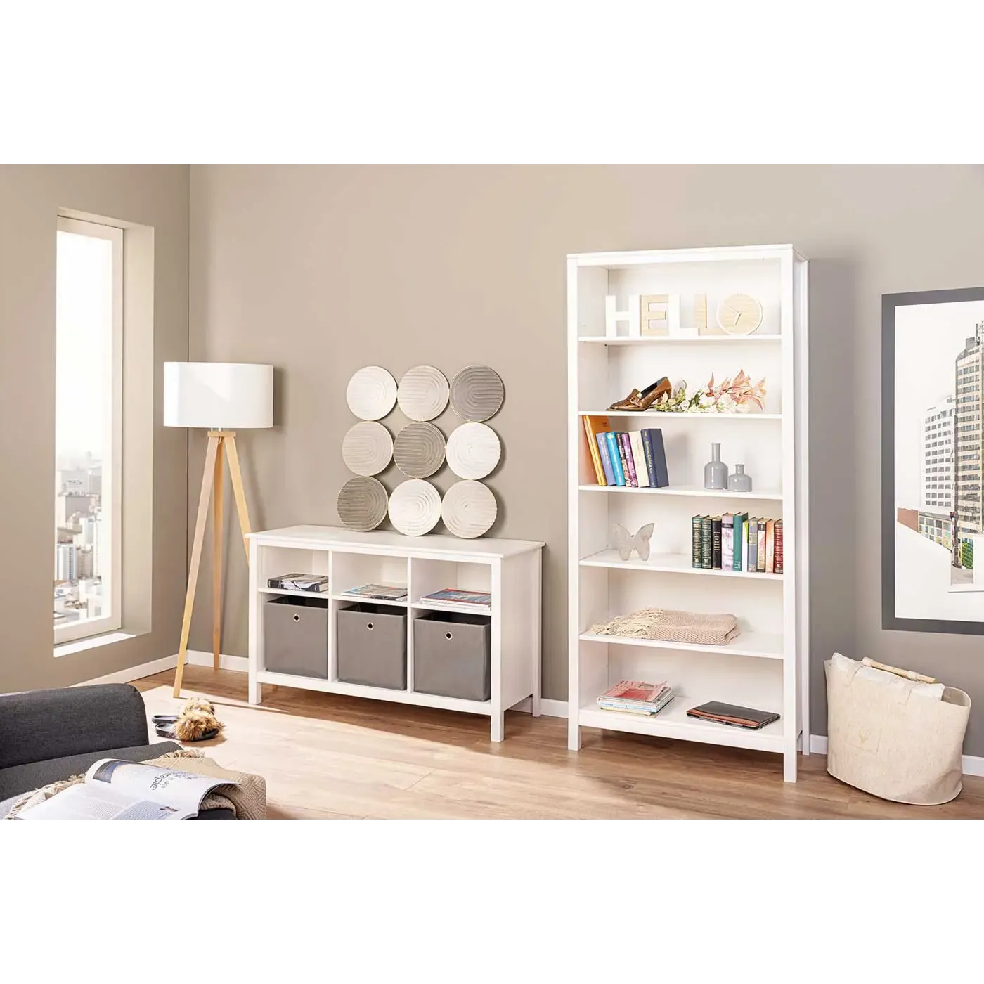 Libreria larga con 5 ripiani a giorno ideale per qualsiasi ambiente della casa ed estremamente versatile. Disponibile nella finitura Bianco laccato e venato.