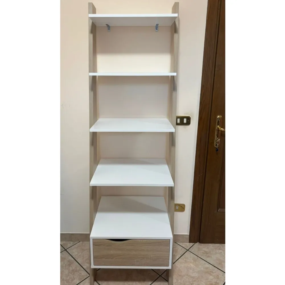 Libreria salvaspazio colore Bianco e Rovere con quattro ripiani e un cassetto. E' disponibile anche in versione Bianco e Nero.