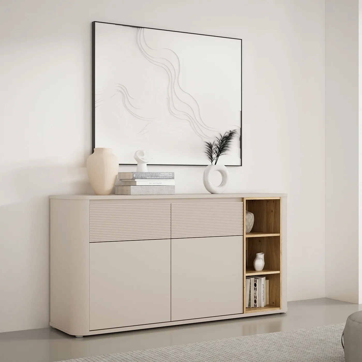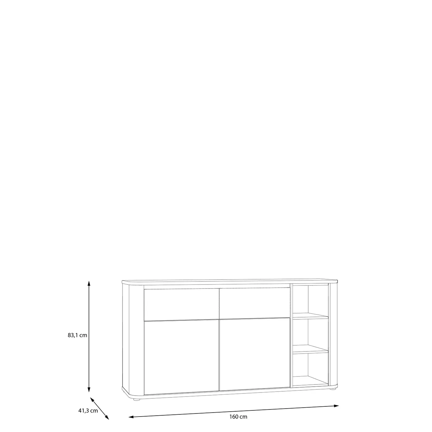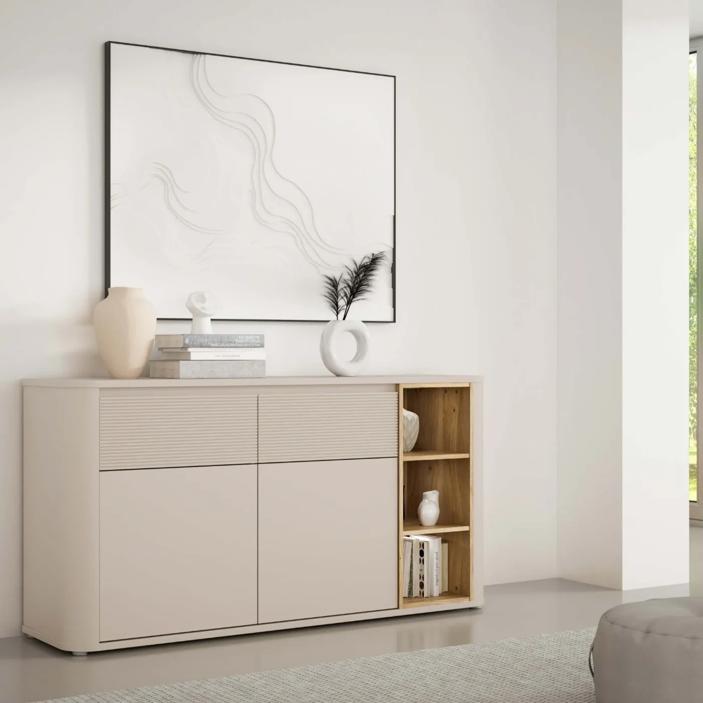 La madia si dota di 2 ante con chiusura ammortizzata (soft close) e altrettanti cassetti ad estrazione totale e caratterizzati da un pregiato effetto millerighe nei suoi frontali. All'interno invece sono presenti 2 ripiani.