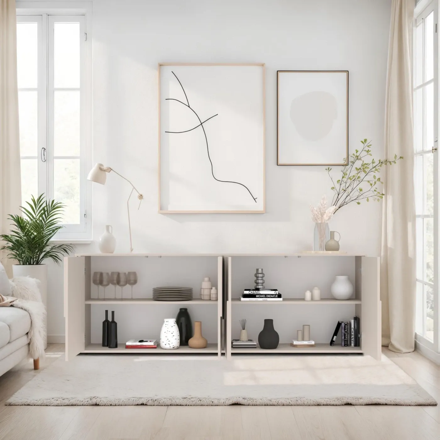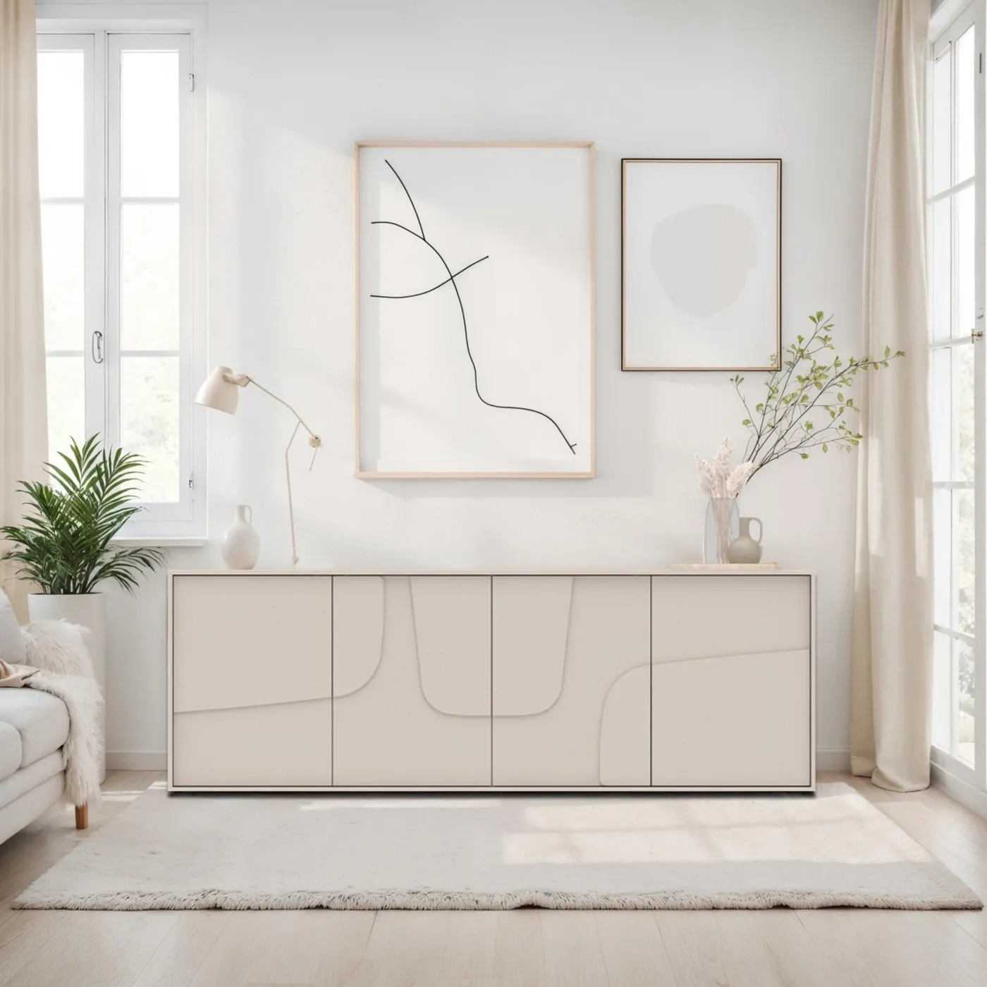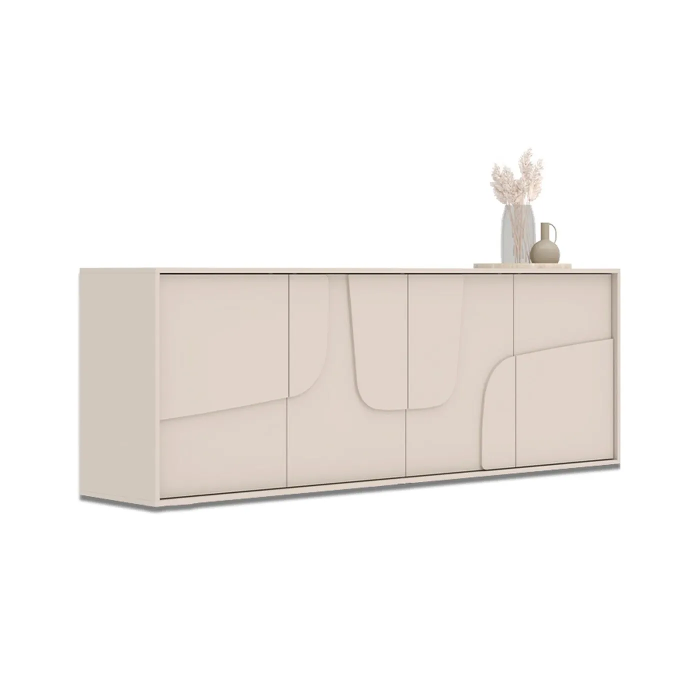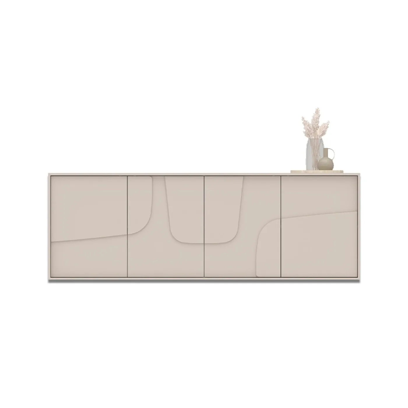 Caratterizzata da una silhouette pulita e moderna, la madia a 4 ante si distingue per l’inserto decorativo sagomato, un dettaglio che conferisce dinamismo alla superficie color Cashmere.