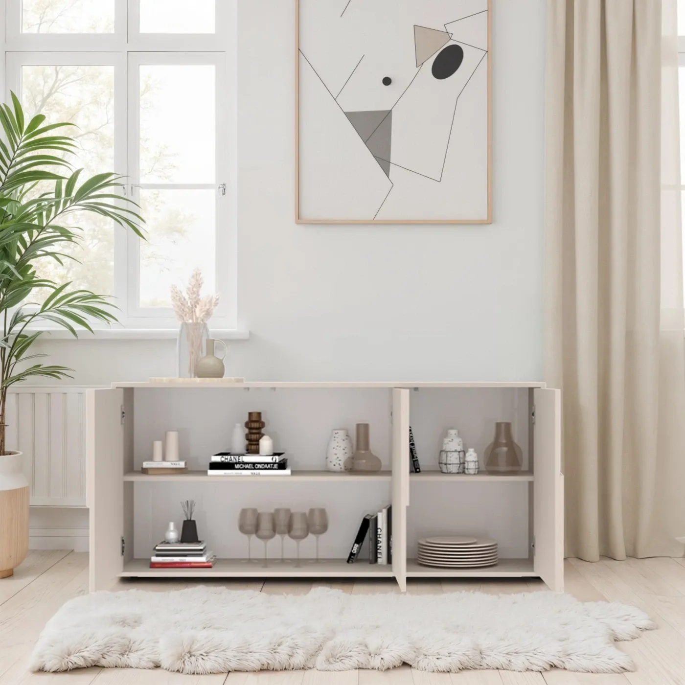 Questa madia è dotata al suo interno di 2 ripiani e si caratterizza per l'elegante e unica nel suo genere inserto sagomato. Disponibile in finitura Cashmere.