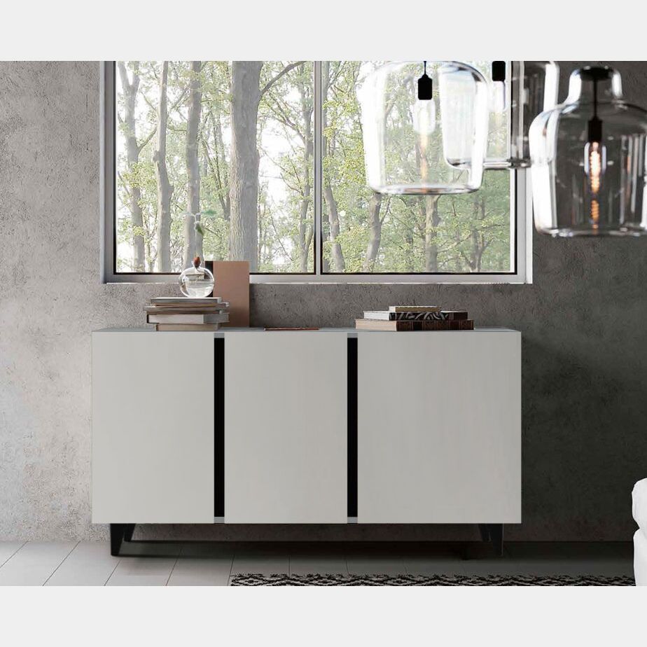 La madia è disponibile in diverse finiture nobilitate e laccate. In questo caso la finitura è Grigio Seta antigraffio.La madia viene fornita con piedini rasoterra neri.