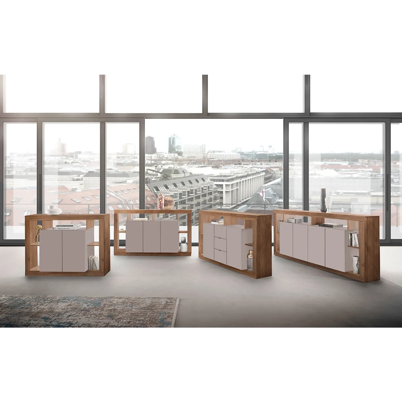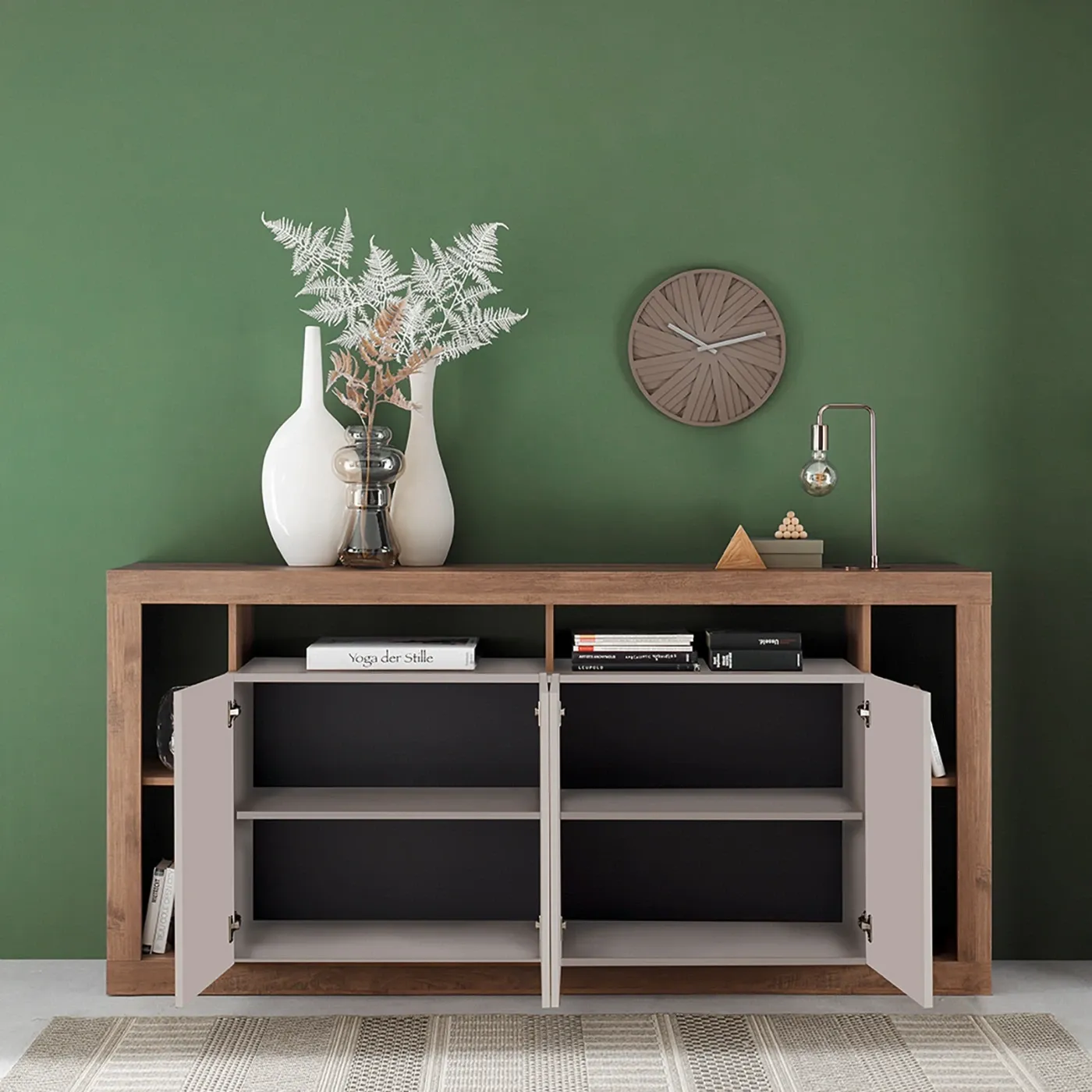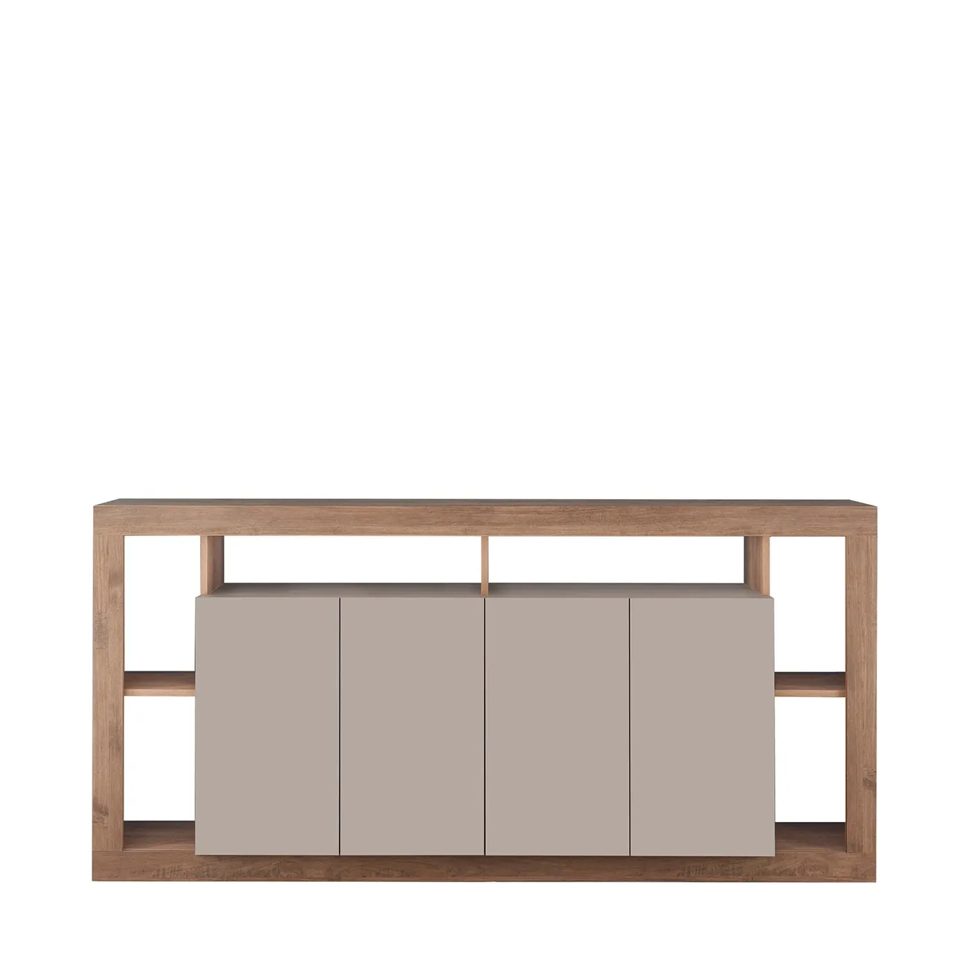 L'articolo prevede un allestimento di 4 ante e di 2 ripiani al suo interno, il tutto colorato con la finitura Cashmere. All'esterno invece è prevista la finitura Mercure per la sovrastruttura, che con il resto della madia forma 6 vani a giorno.