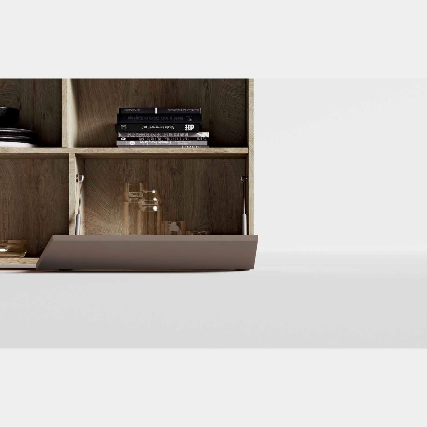 La madia, grazie alla possibilità di cambiare le finiture e al suo design unico e moderno, si adatta facilmente a tutti gli ambienti. E' composta da un'ampia anta in finitura bronzo che presenta al suo interno un ripiano e da una ribalta sempre nella stessa finitura. I ripiani sono in finitura quercia, così come il vano a giorno.