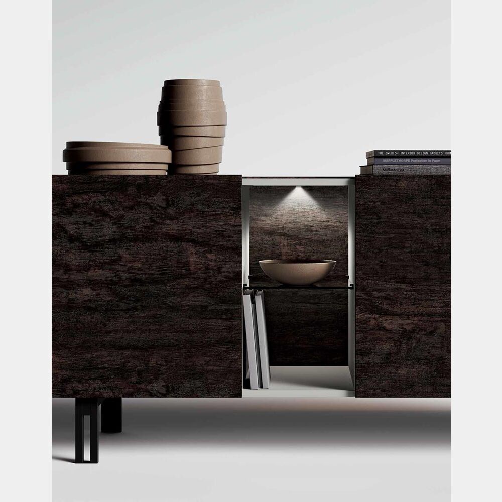 E' caraterrizata dalla presenza di 3 ante in finitura Legno bruciato e da 3 vani a giorno con ripiano in vetro fumè. Pensata per avere un maggiore spazio utile di appoggio, questa madia offre la soluzione ideale che unisce eleganza e praticità. La struttura è in Grigio seta, è possibile personalizzare le finiture. La madia vine fornita con i piedini base H.2 cm.