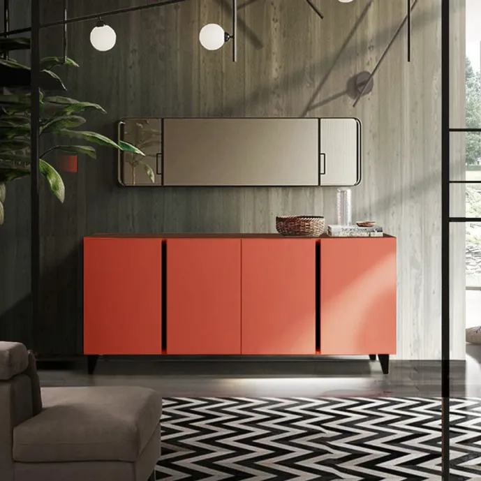 La madia moderna a quattro ante, proposta da Zenzero Shop, presenta una struttura in effetto cannettato, mentre i frontali sono di un intenso color Corallo.