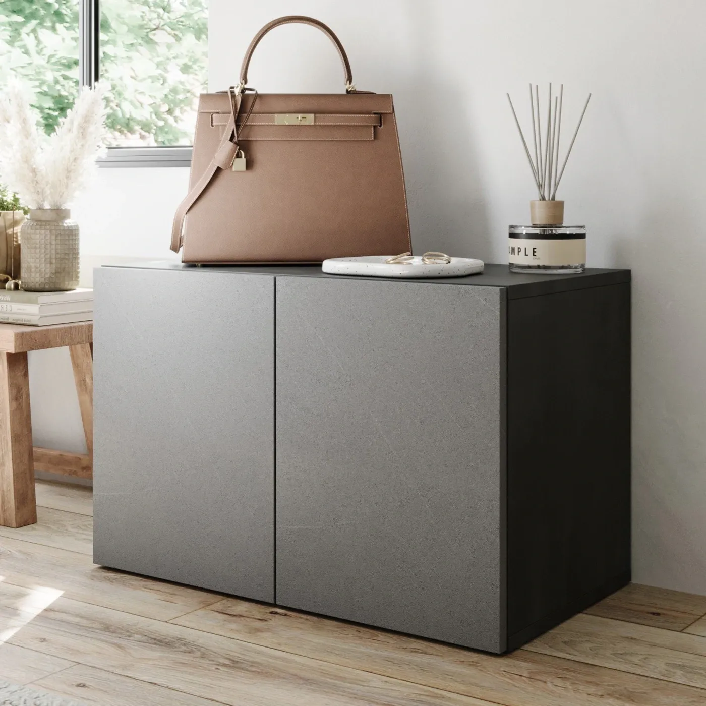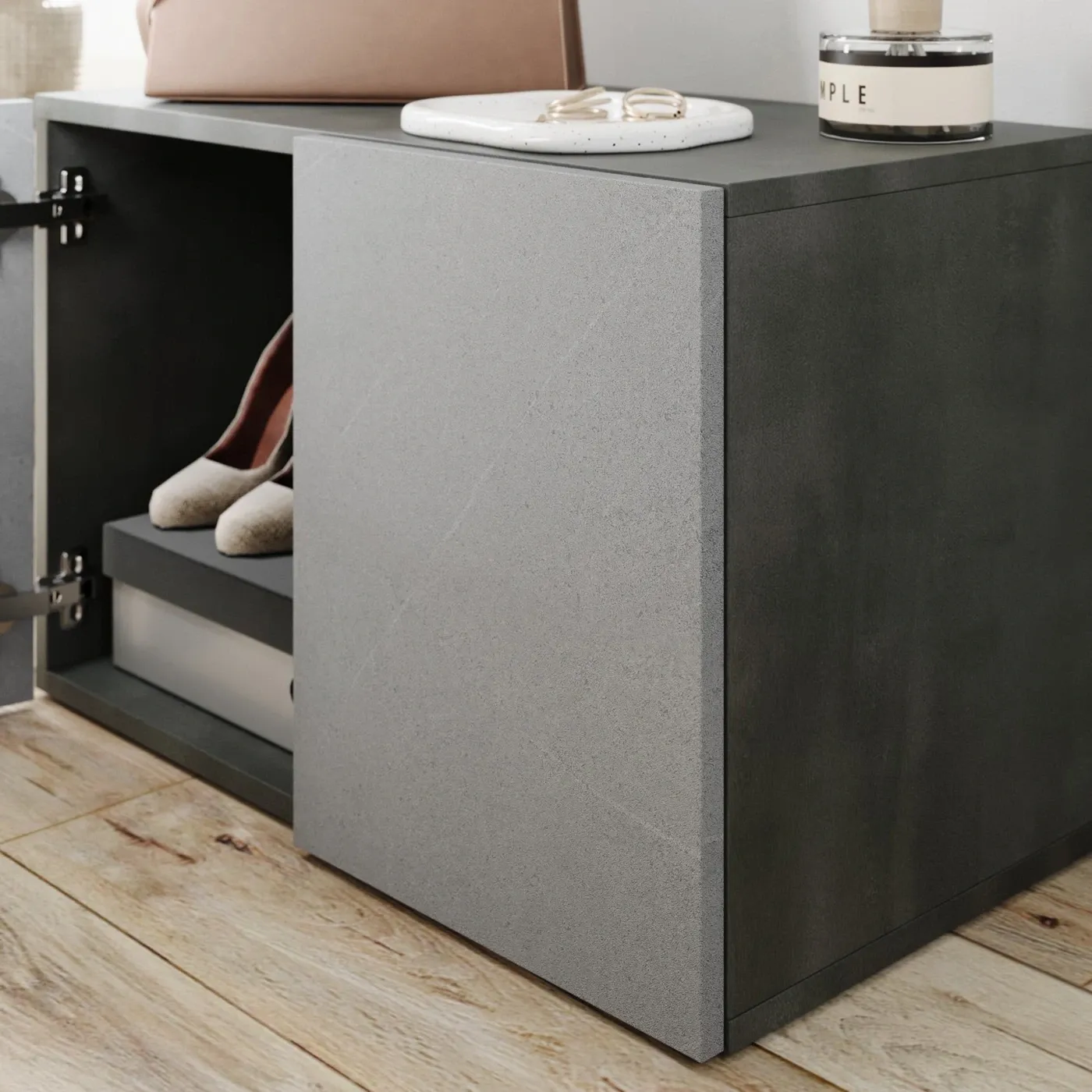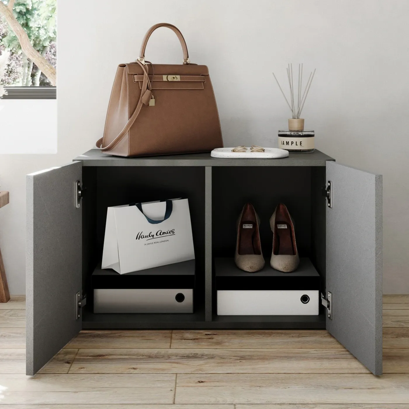 Ciò che la distingue è la doppia colorazione in Ghisa, la quale si alterna benissimo con il color Pietra, presente soprattutto sulle ante. Qui esse si contano in numero di 2 e coprono un ampio spazio all'interno del quale conservare scarpe pronte all'uso in caso di uscite o di ritorni a casa.