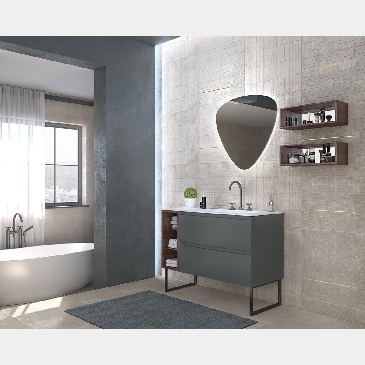 Il mobile da bagno con piedi presenta un design semplice e moderno, caratterizzato dall'accostamento di due finiture che differiscono sia per texure che colorazione. Il Grigio basalto opaco viene valorizzato dal vano a giorno con ripiani in vetro in Noce canaletto, l'accostamento genera un piacevole contrasto che personalizza l'ambiente.