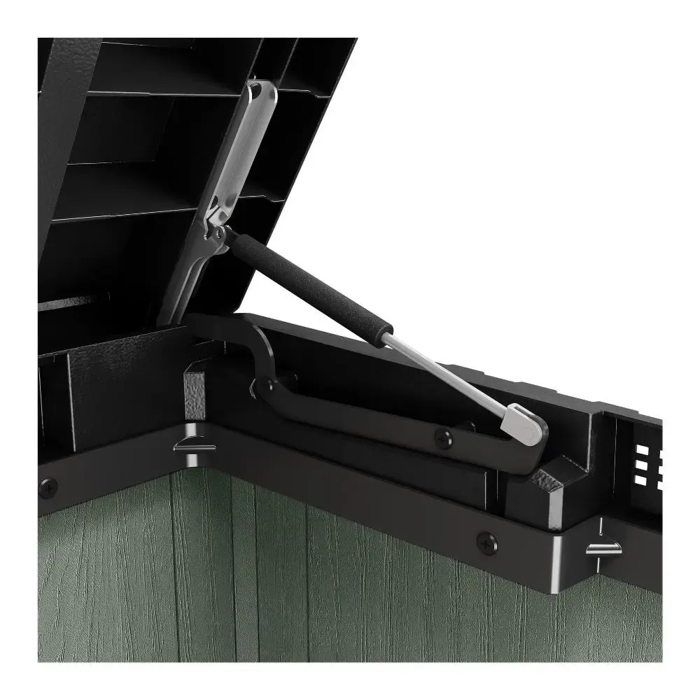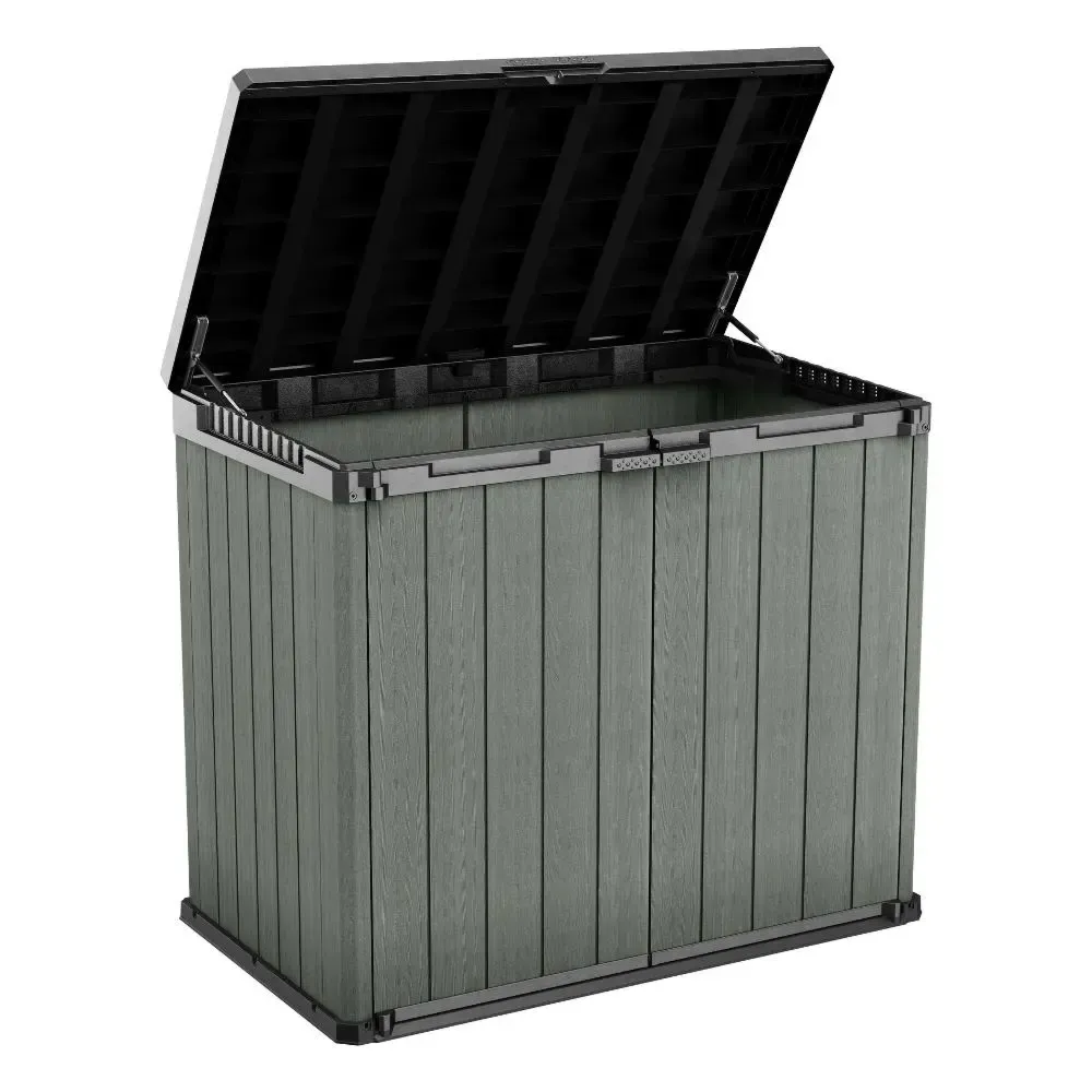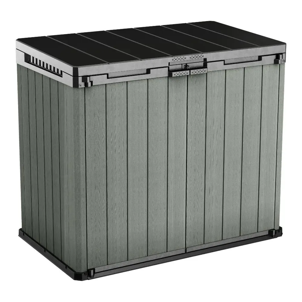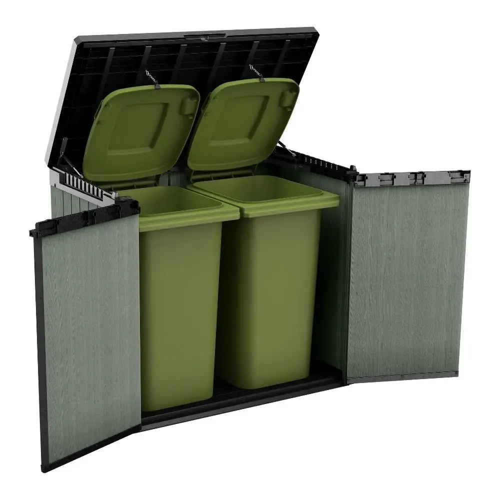Alternativamente, può contenere due bidoni da 240 litri. La struttura è realizzata con pannelli pitturabili in DUOTECH™, particolare finitura che riproduce alla vista e al tatto l'effetto del legno. Il coperchio è dotato di due pistoni per facilitare l'apertura. Concepito per durare nel tempo, è resistente agli agenti atmosferici ed è dotato di un pavimento rialzato che protegge il contenuto da fango e acqua.