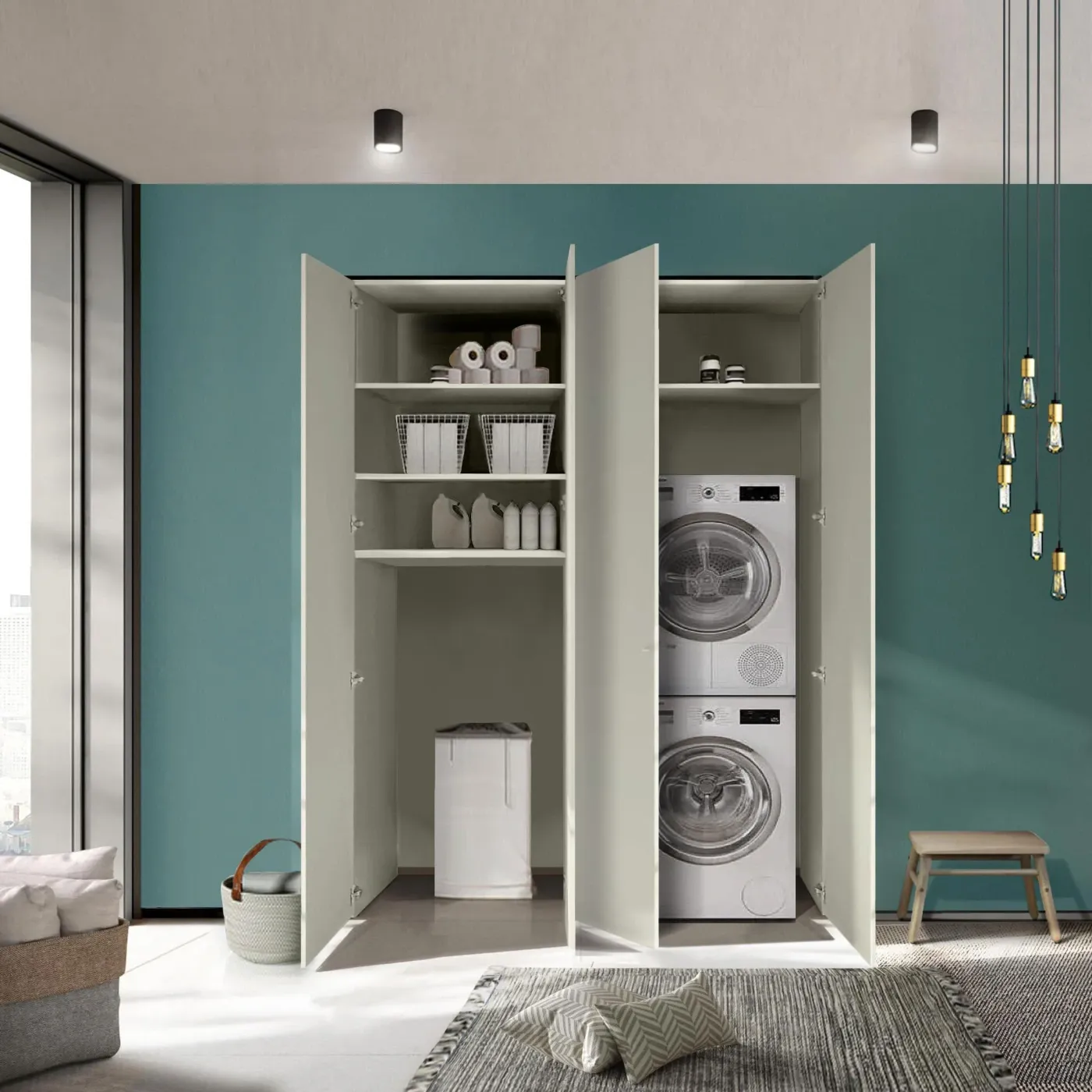 Nel modulo di destra è possibile inserire lavatrice e asciugatrice, così da nasconderle alla vista quando non utilizzate.