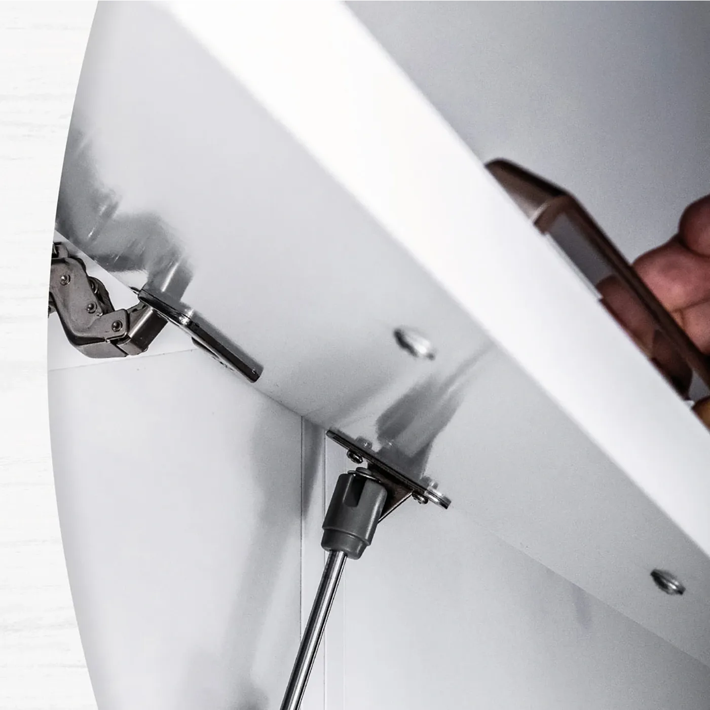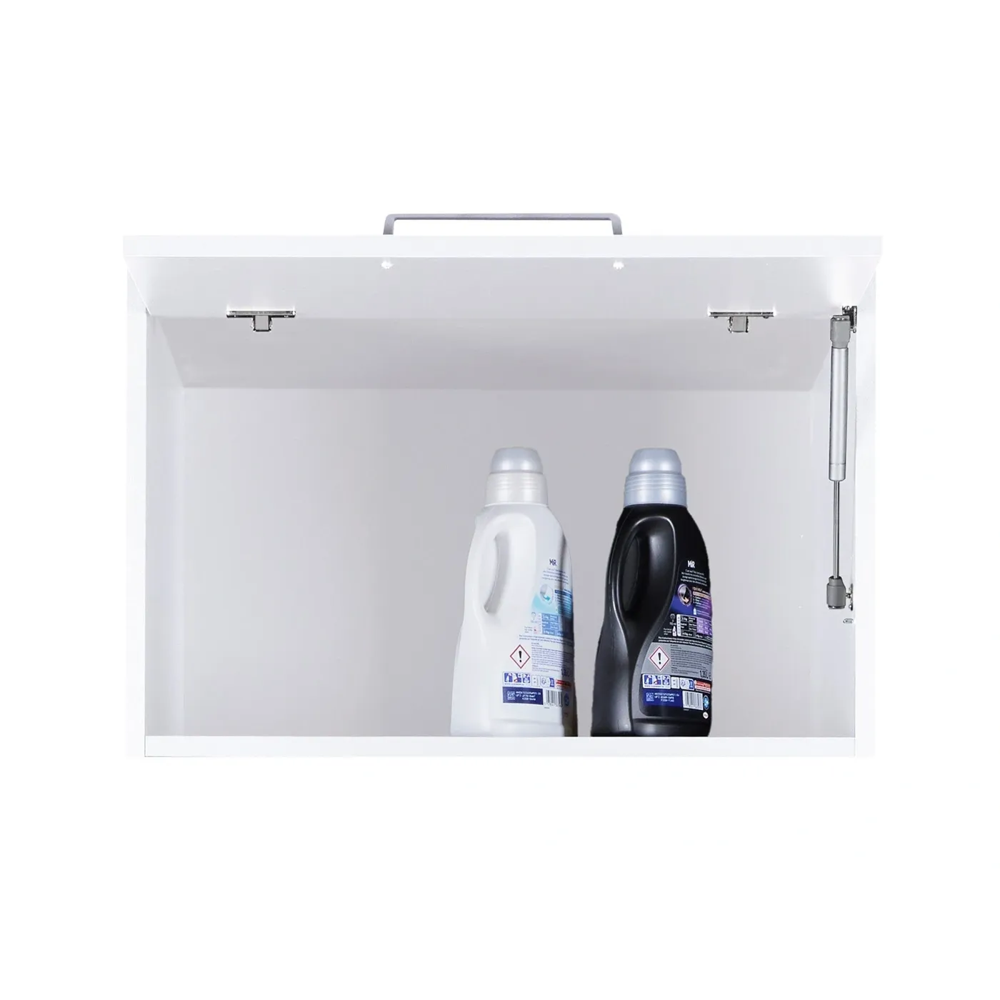 L'articolo è dotato di un'anta a ribalta con chiusura soft close e di un ampio vano contenitore, ideale per contenere oggetti come asciugamani, detersivi o altri strumenti per la pulizia. Le maniglie sono in alluminio.