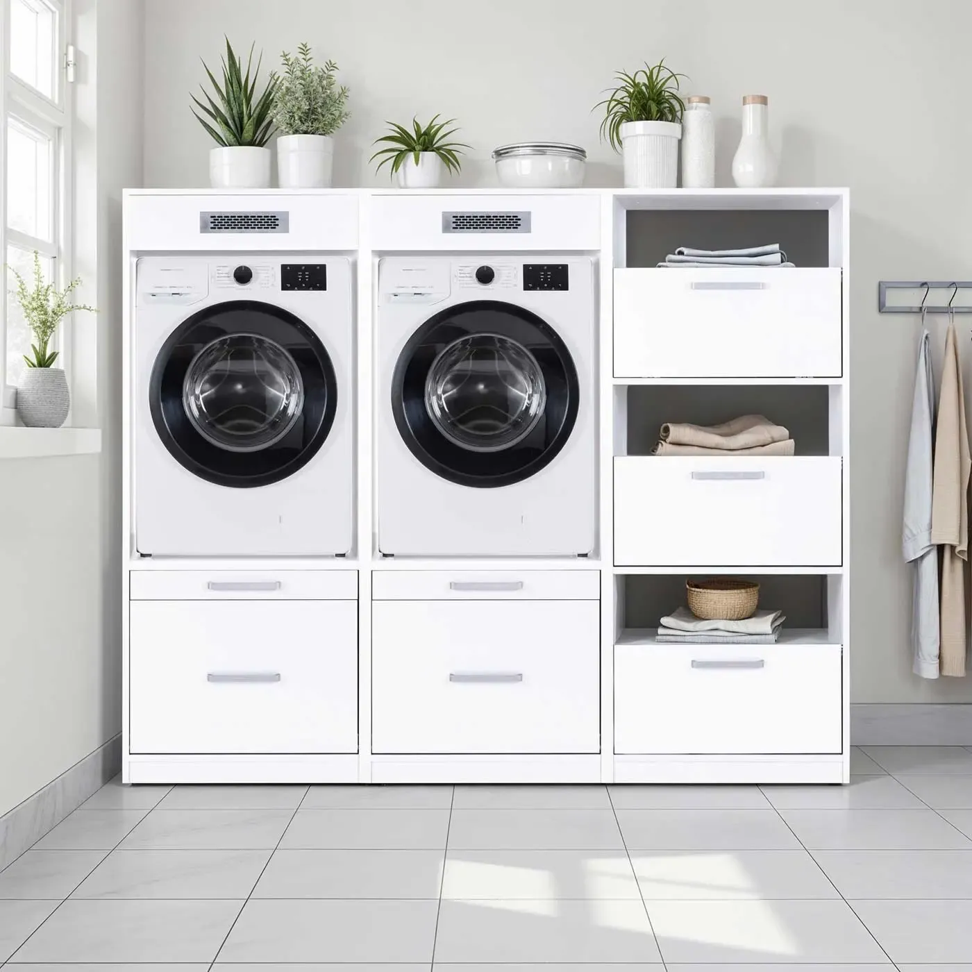 Composizione di 2 mobili porta lavatrice e dotata di 2 cassetti per conservare detersivi, asciugamani e altri strumenti utili alla pulizia della casa. Ad essa si unisce una comoda cassettiera a 3 larghi cassettoni.