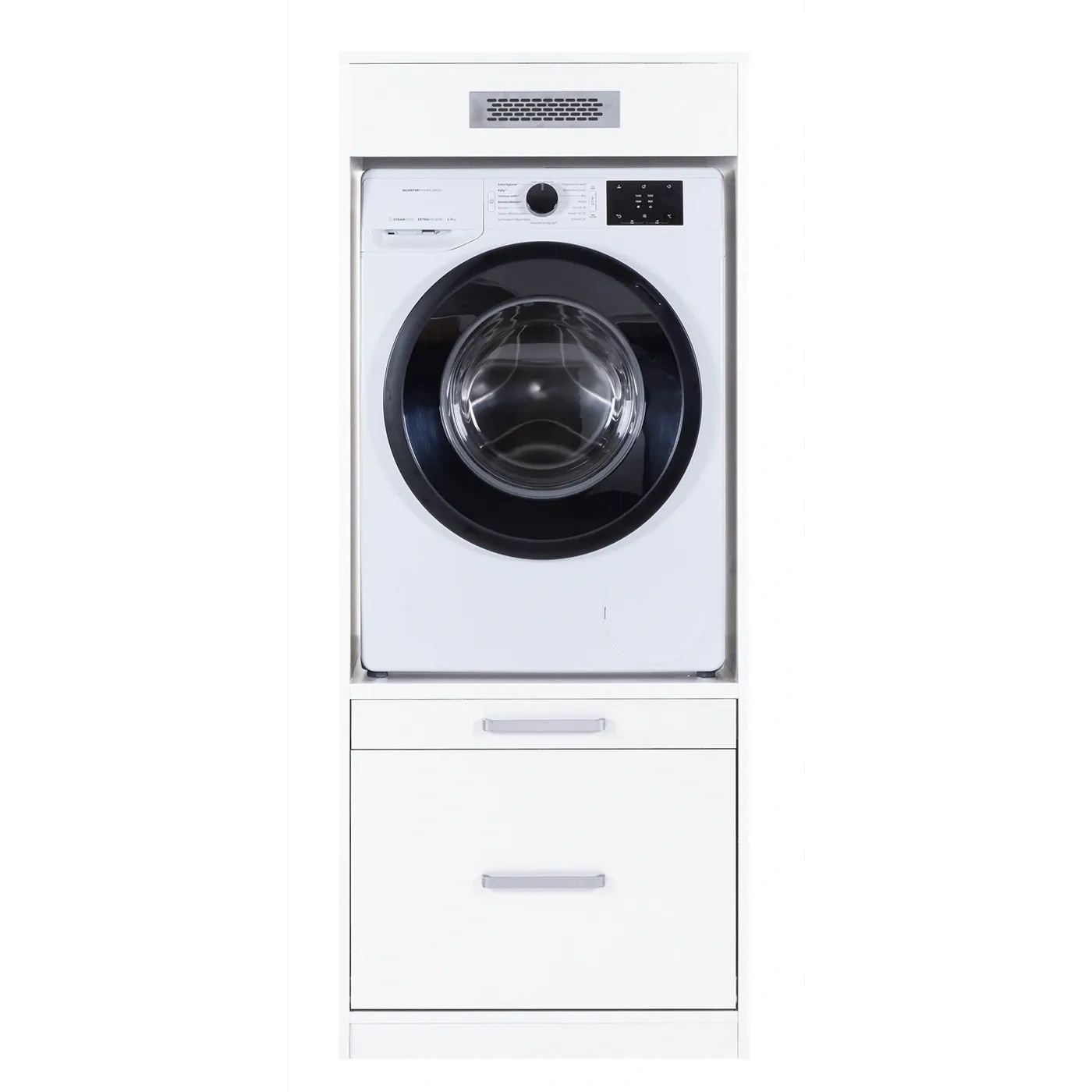 Composizione di 2 mobili porta lavatrice e contenitori, con cassettiera abbinata, L.201 H.164 P.68, Bianco