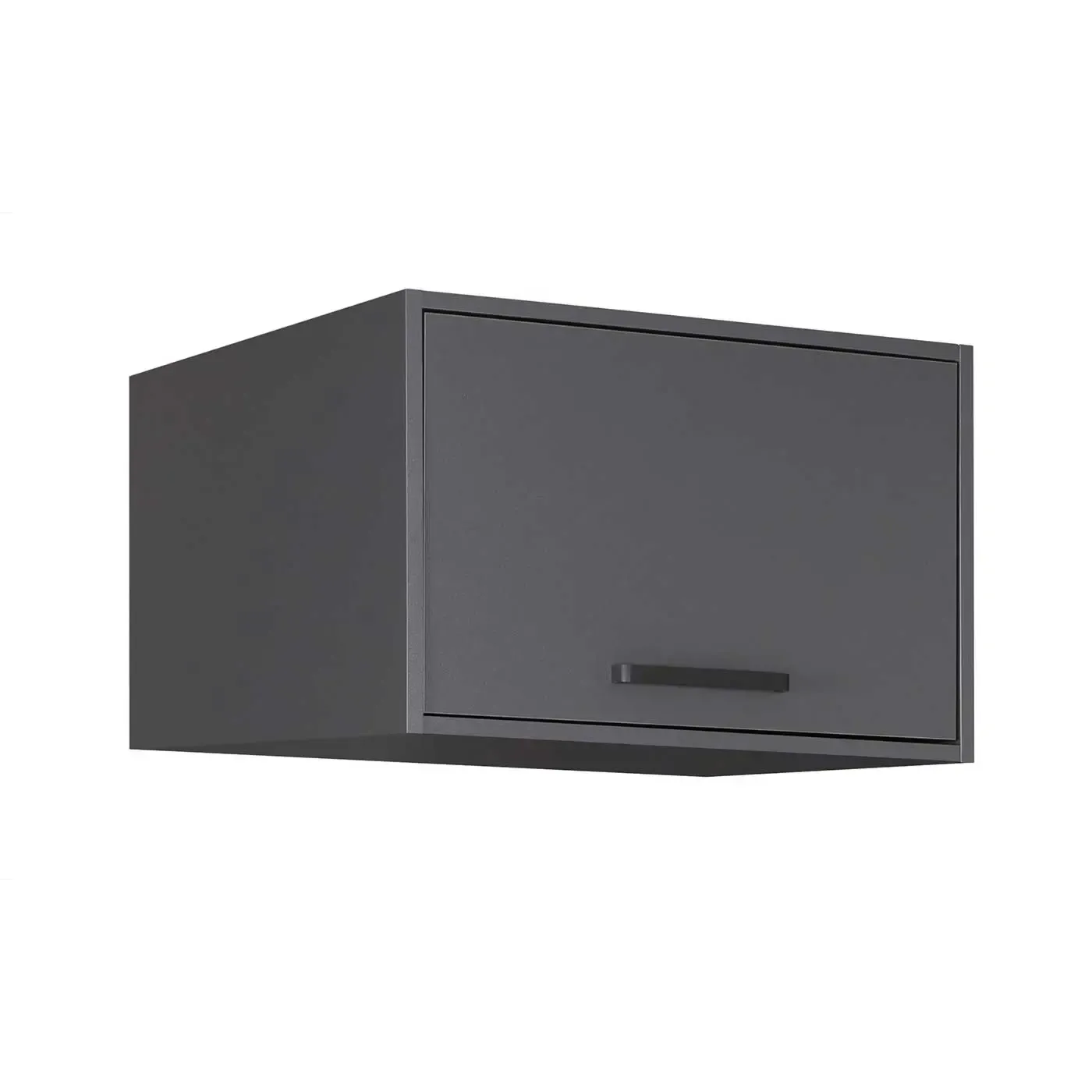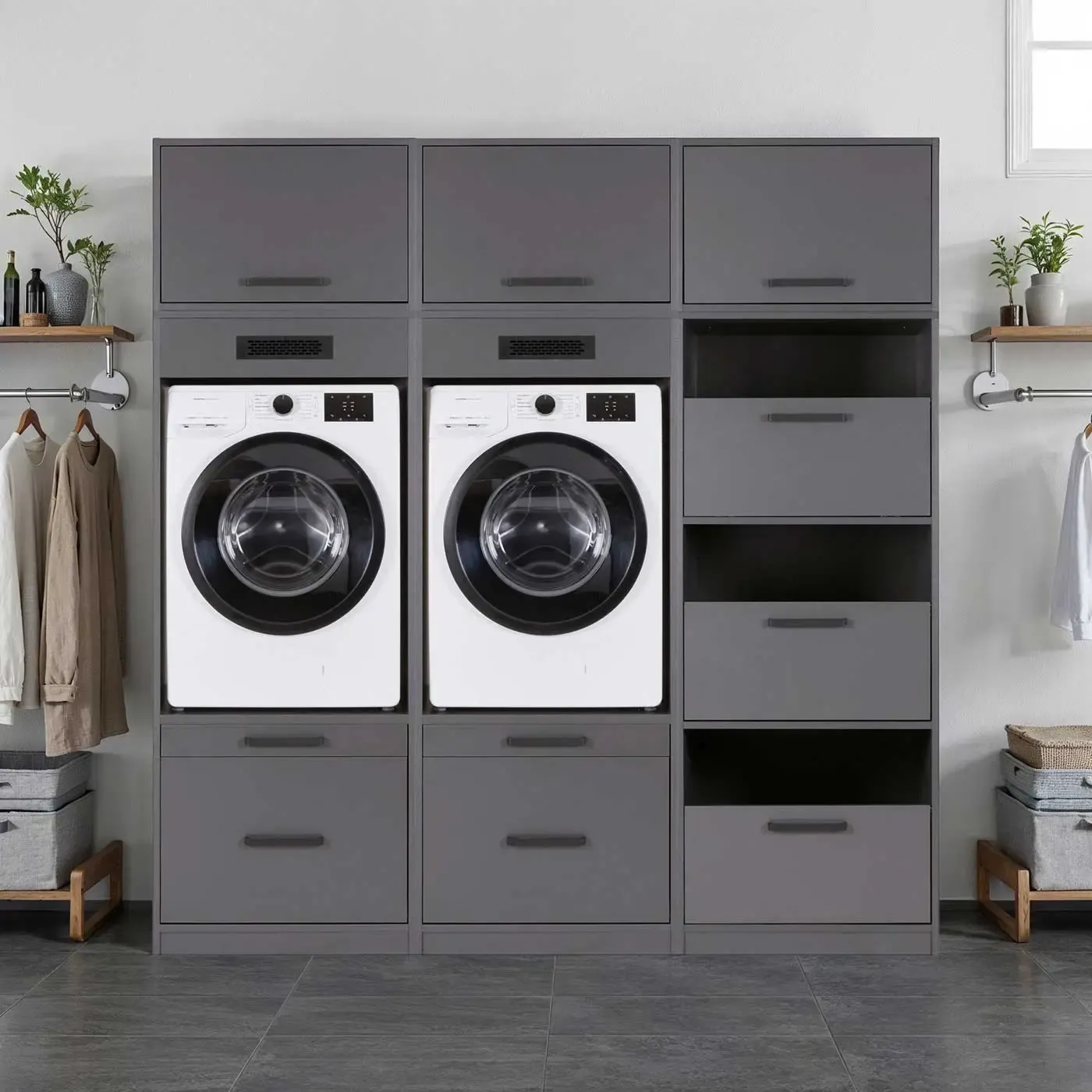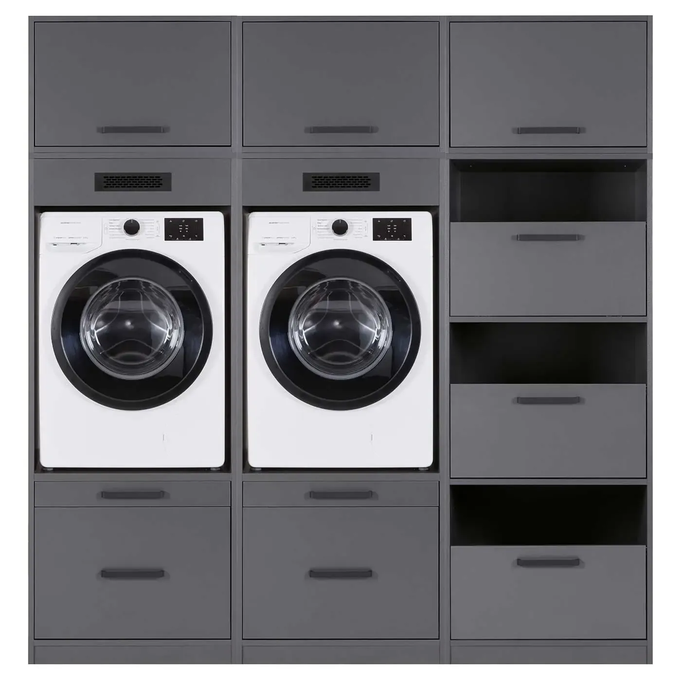 Composizione di 2 mobili porta lavatrice e contenitori, con cassettiera abbinata e pensili, L.201 H.208 P.68, Antracite