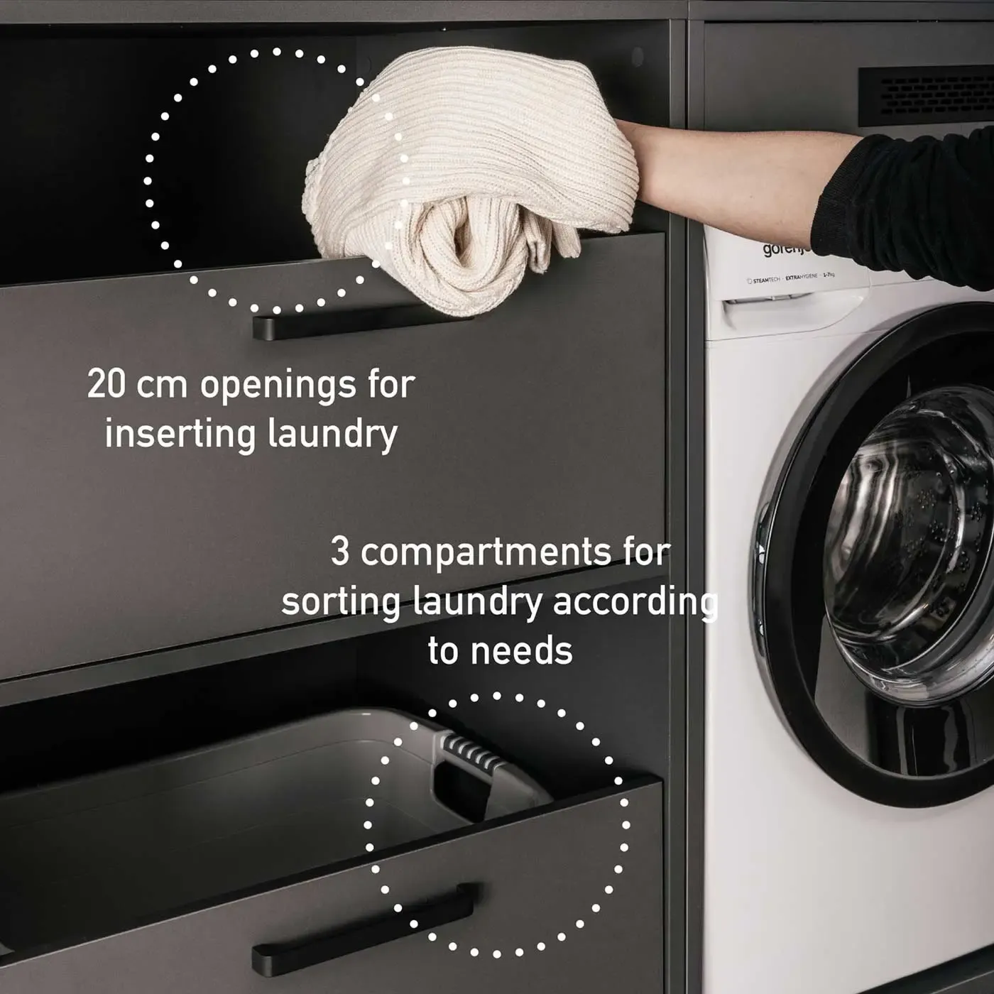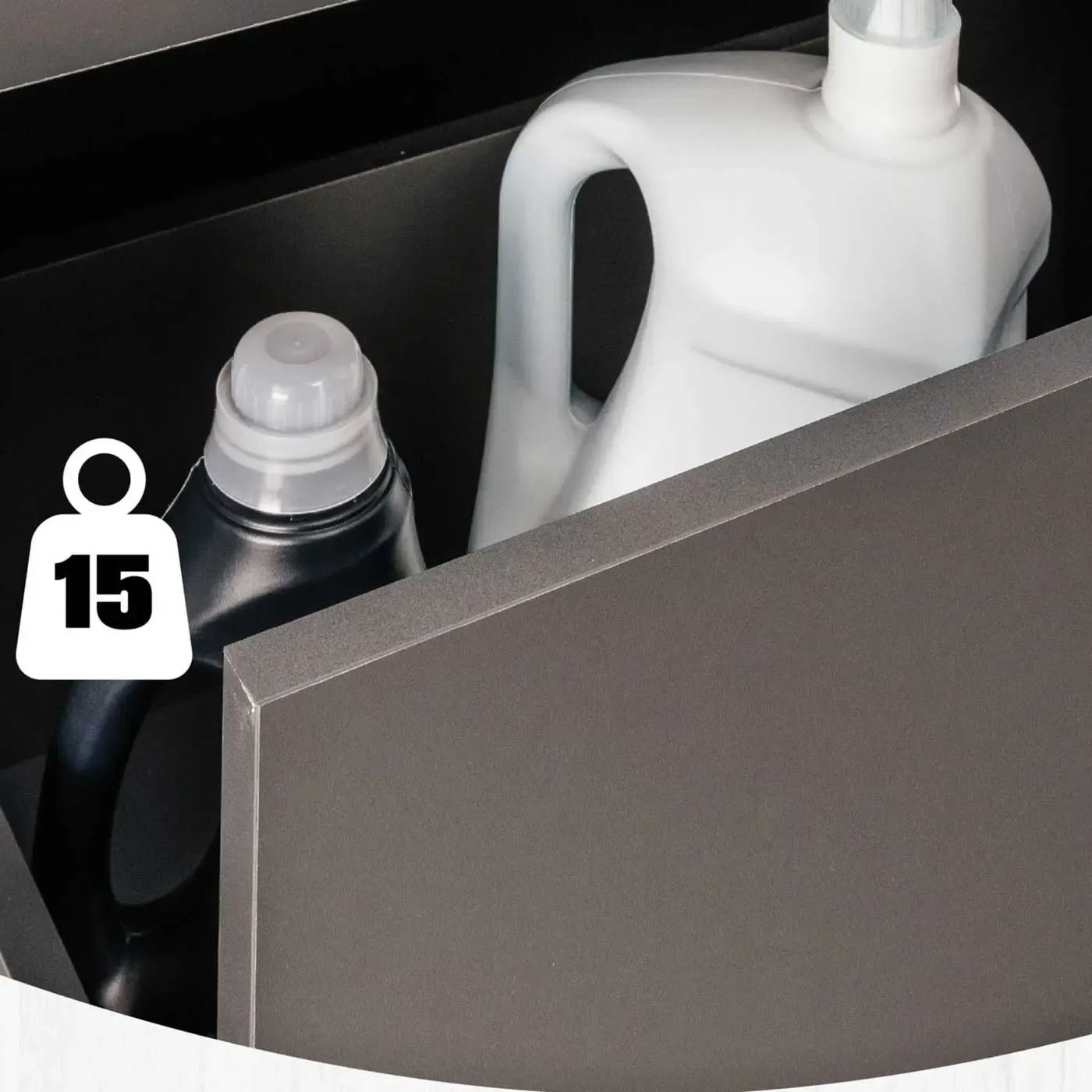 L'articolo è dotato di un mobile portalavatrice a 2 cassetti, con il più piccolo e costituente un piano estraibile per potervi appoggiare ad esempio un cesto porta biancheria (massima portata 10 Kg) mentre il restante costituisce un cassettone estraibile (massima portata 15 Kg) con chiusura soft close per contenere oggetti come asciugamani detersivi o altri strumenti per la pulizia.
