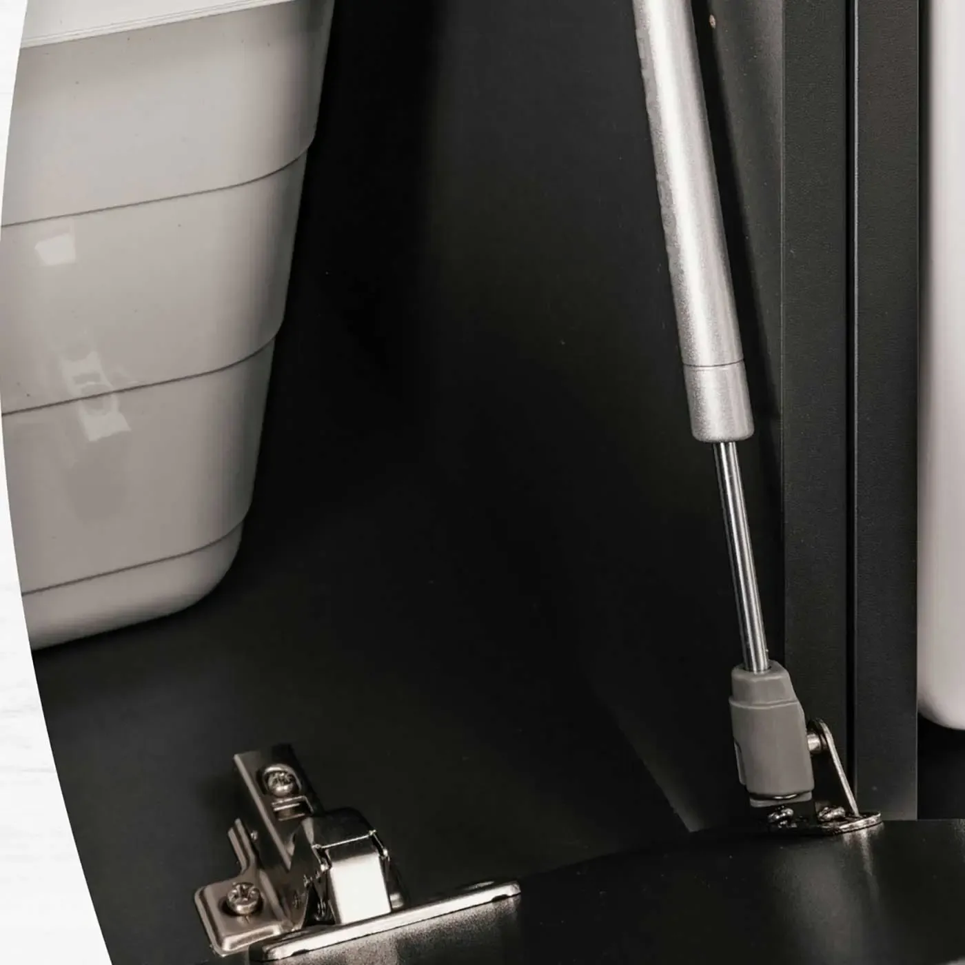 Dall'altro lato è invece presente un armadietto ad un'anta con chiusura soft close e di 3 ampi ripiani contenitori (regolabili grazie agli appositi fori sui fianchi), ideale per contenere oggetti come asciugamani detersivi, o altri strumenti per la pulizia.