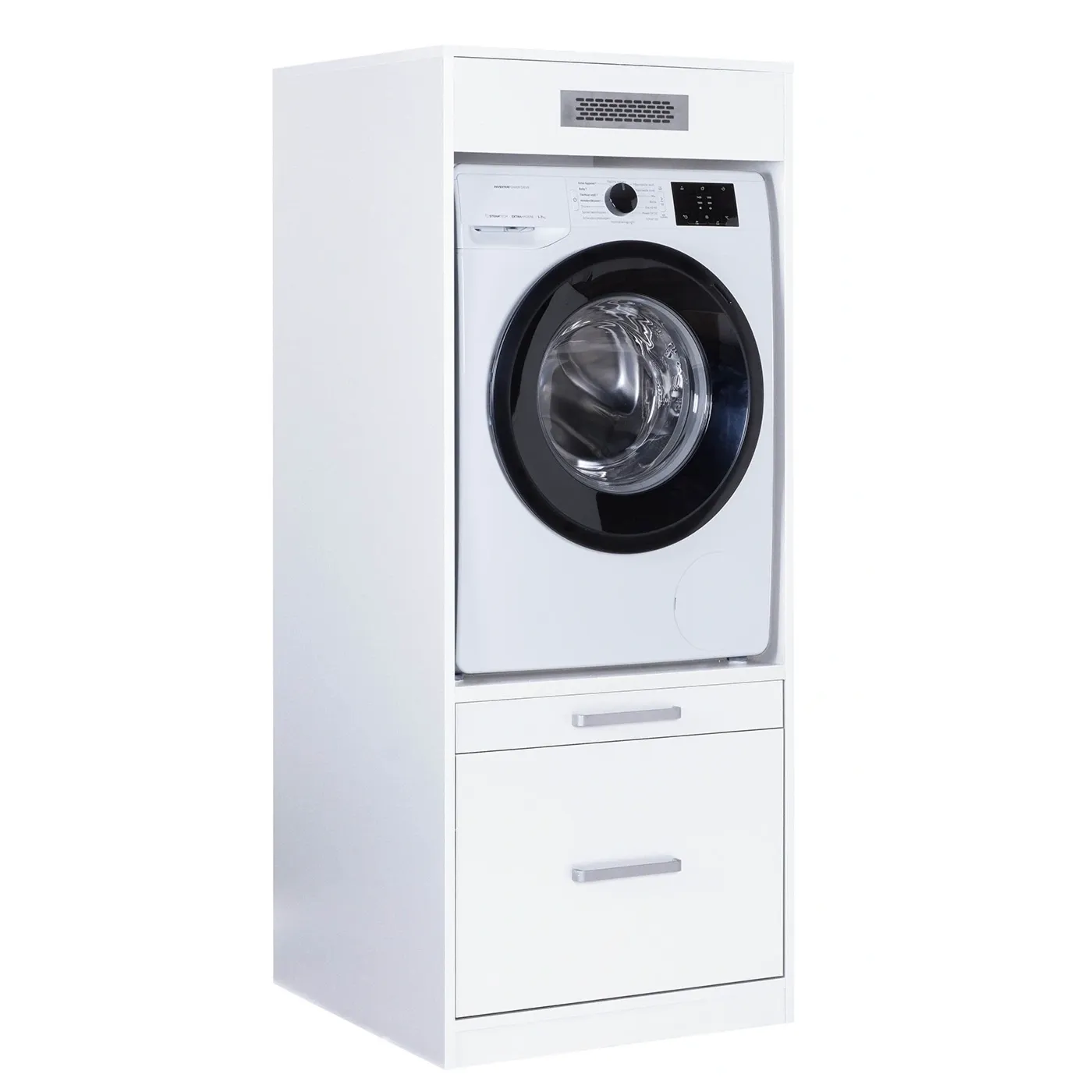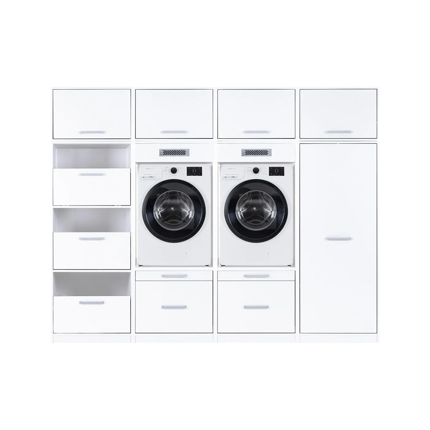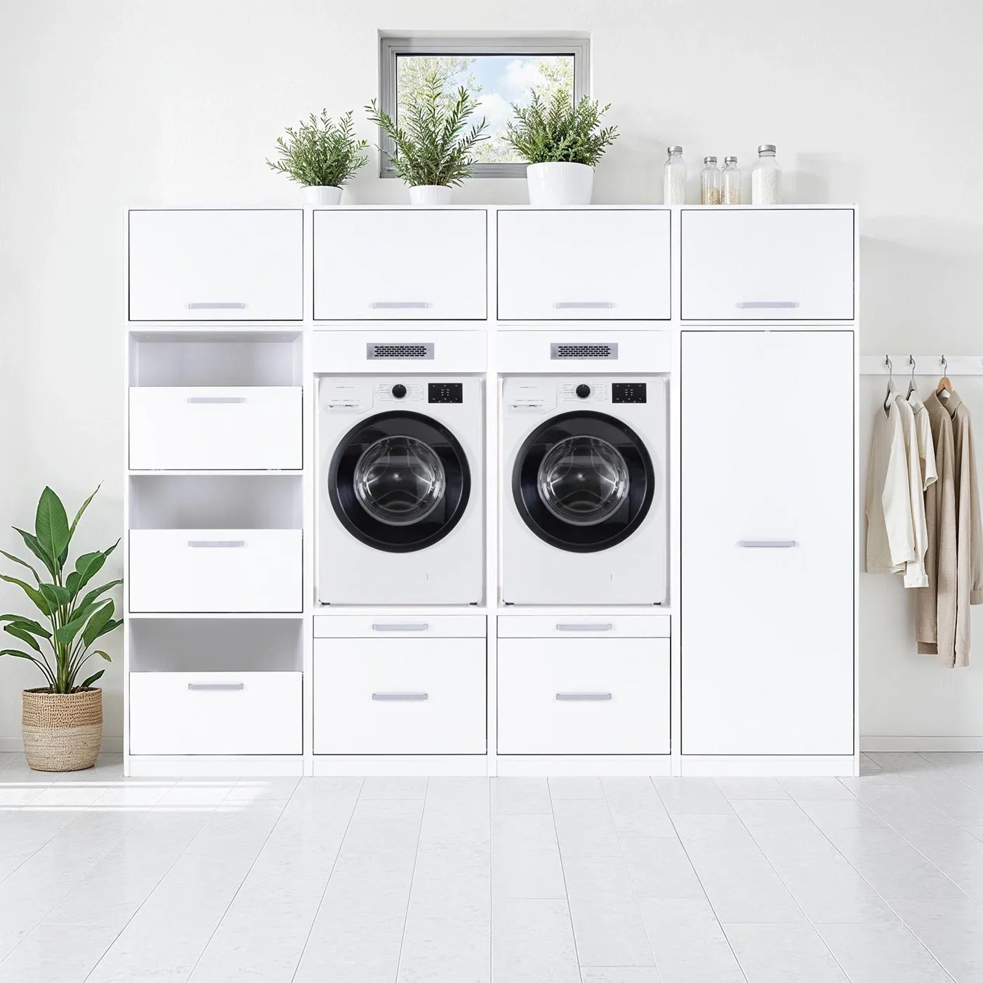 Composizione di mobili porta lavatrice, armadietto e cassettiera con pensili, L.268 H.208 P.68, Bianco