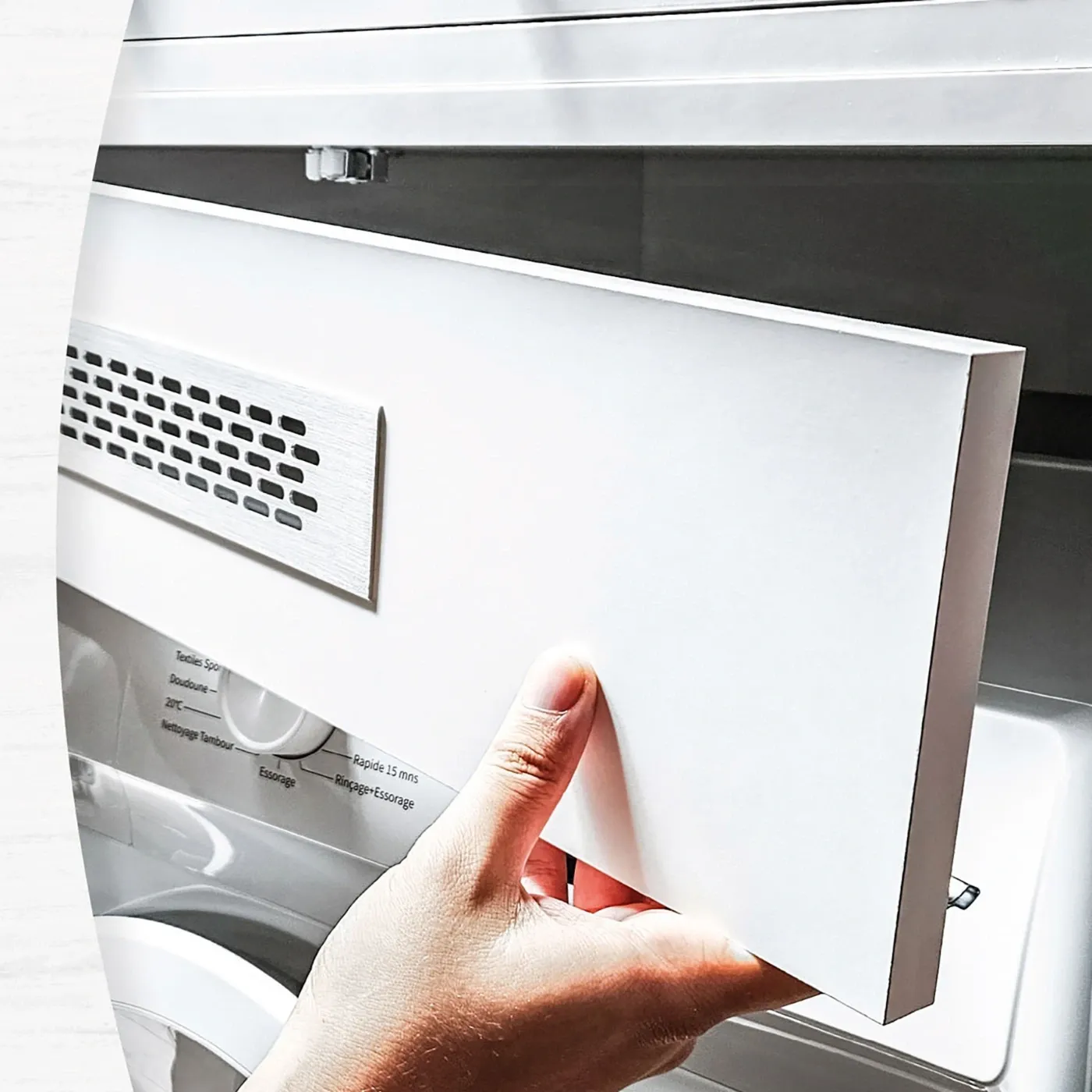 Gli zoccoli del mobile sono facilmente rimovibili come anche il frontale dello spazio di aerazione posto sopra al vano per la lavatrice. Le maniglie sono in alluminio.