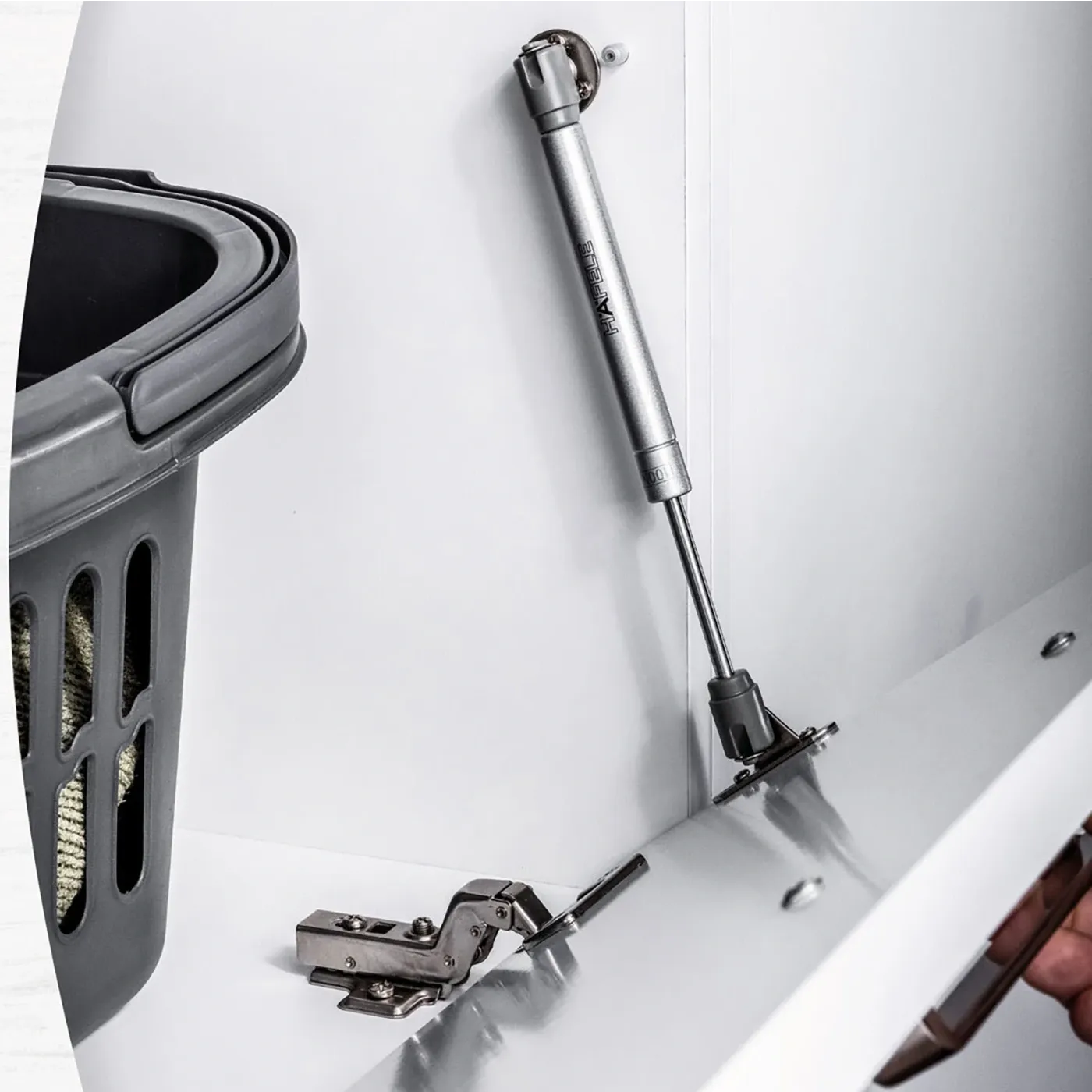 Mobile dotato di 3 cassettoni contenitori con apertura a vasistas per conservare detersivi, asciugamani e altri strumenti utili alla pulizia della casa. Assieme sono presenti 2 armadietti e un mobile portalavatrice.