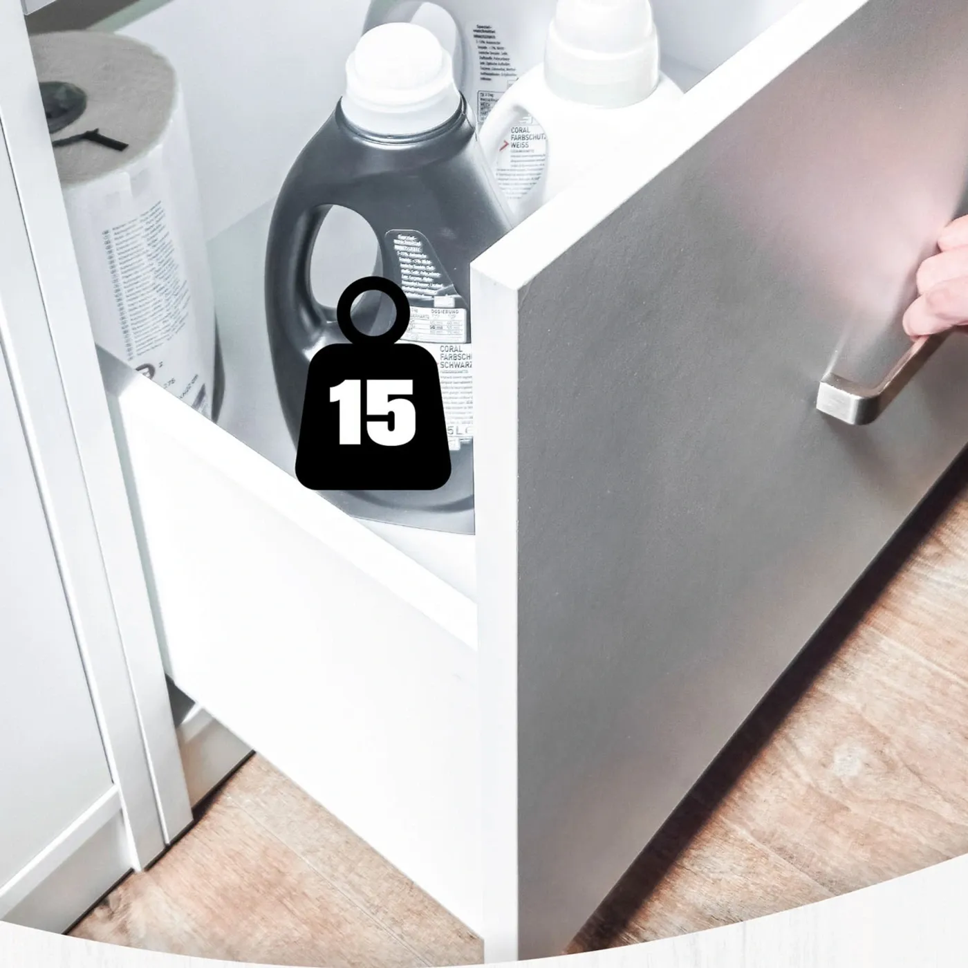 L'articolo è dotato di un porta lavatrice a 2 cassetti, con il più piccolo e costituente un piano estraibile per potervi appoggiare ad esempio un cesto porta biancheria (massima portata 10 Kg) mentre il restante costituisce un cassettone estraibile (massima portata 15 Kg) con chiusura soft close per contenere oggetti come asciugamani detersivi o altri strumenti per la pulizia.