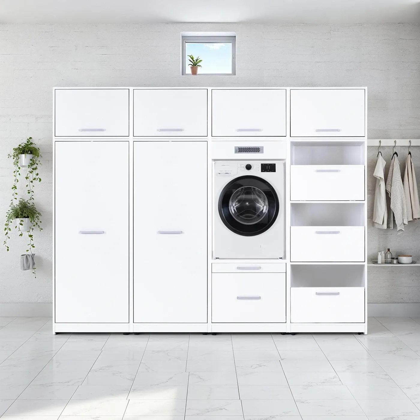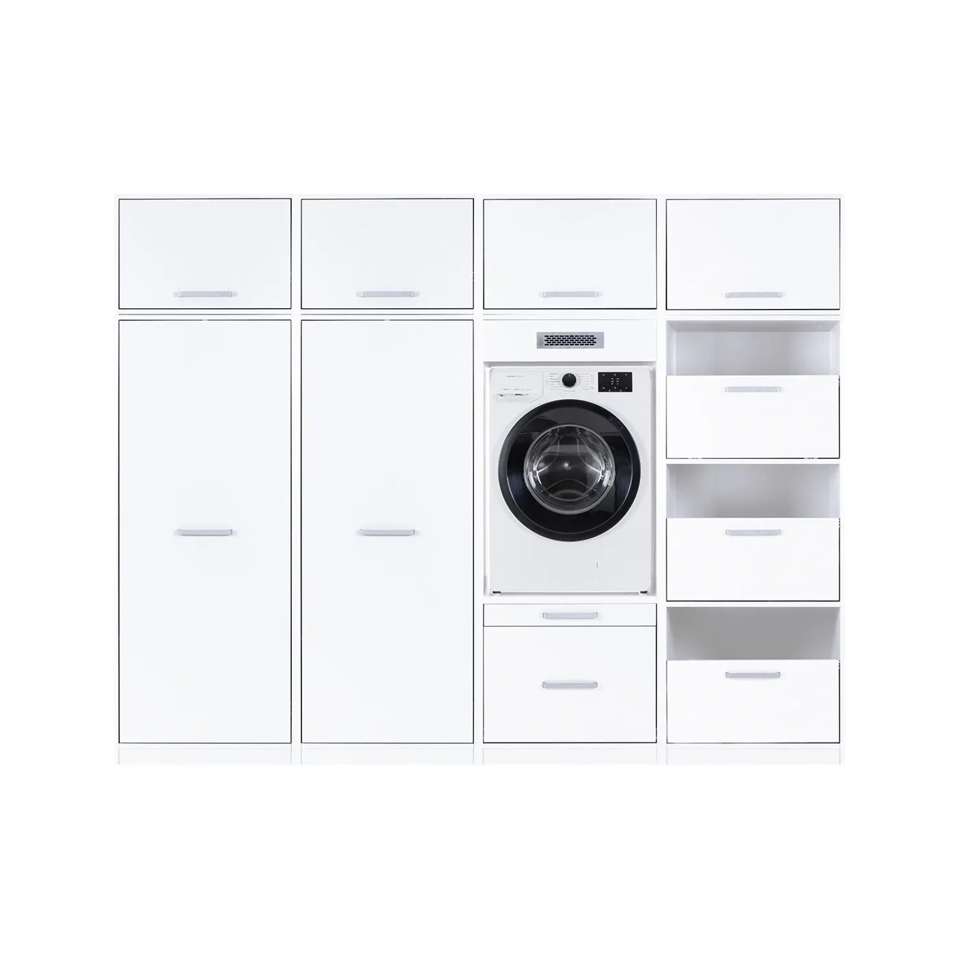 Composizione di mobile porta lavatrice, 2 armadietti e cassettiera, L.268 H.208 P.68, Bianco