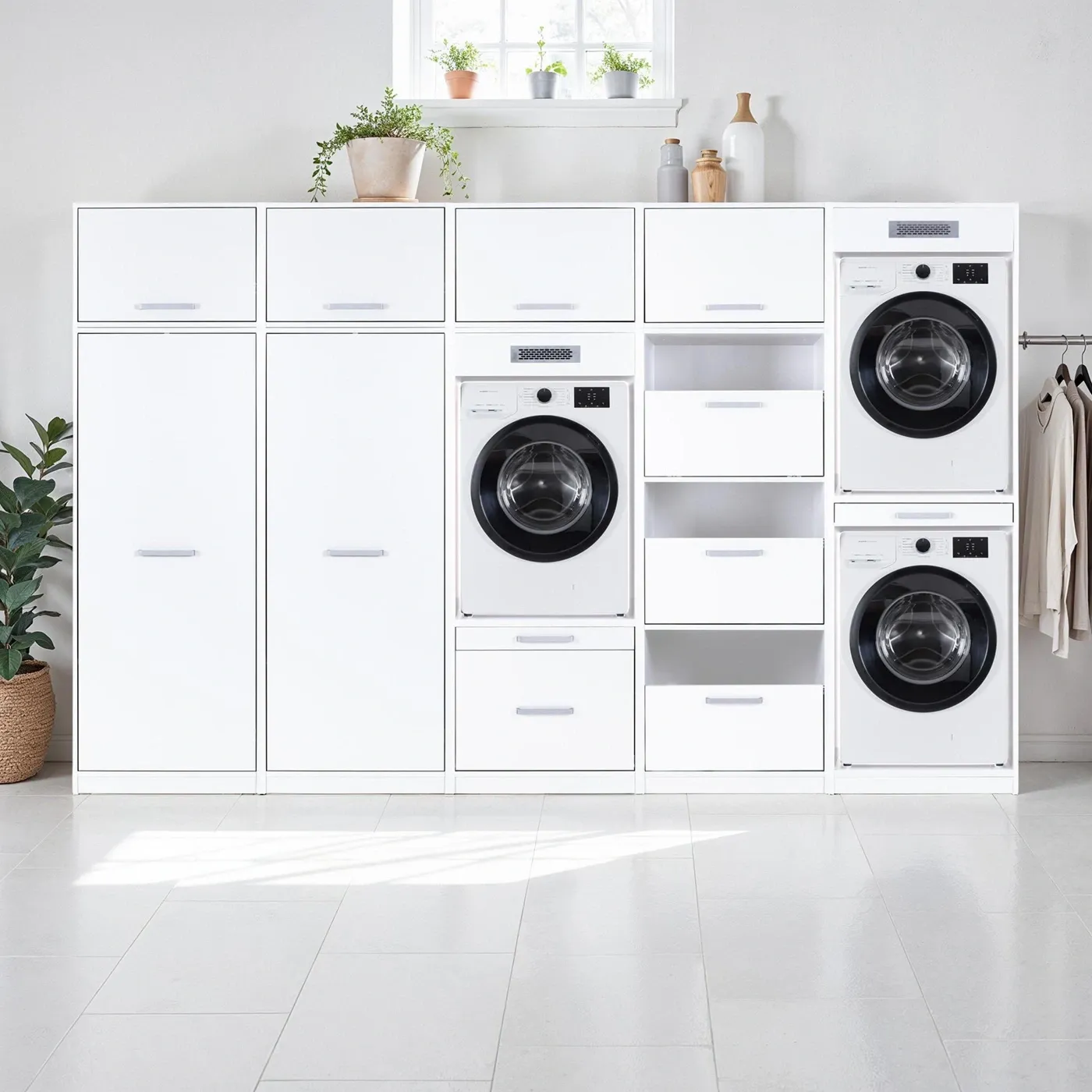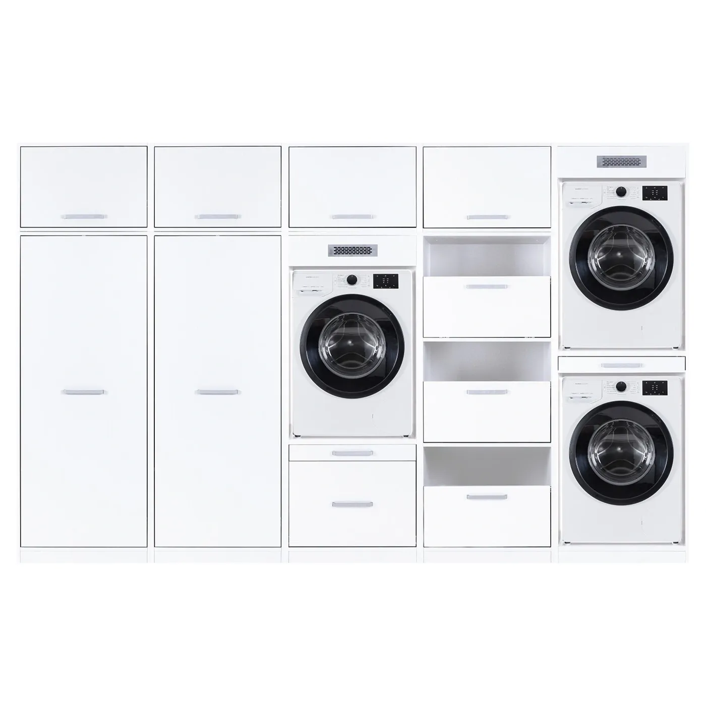 Composizione di 2 mobili porta lavatrice, 2 armadietti e cassettiera, L.335 H.208 P.68, Bianco