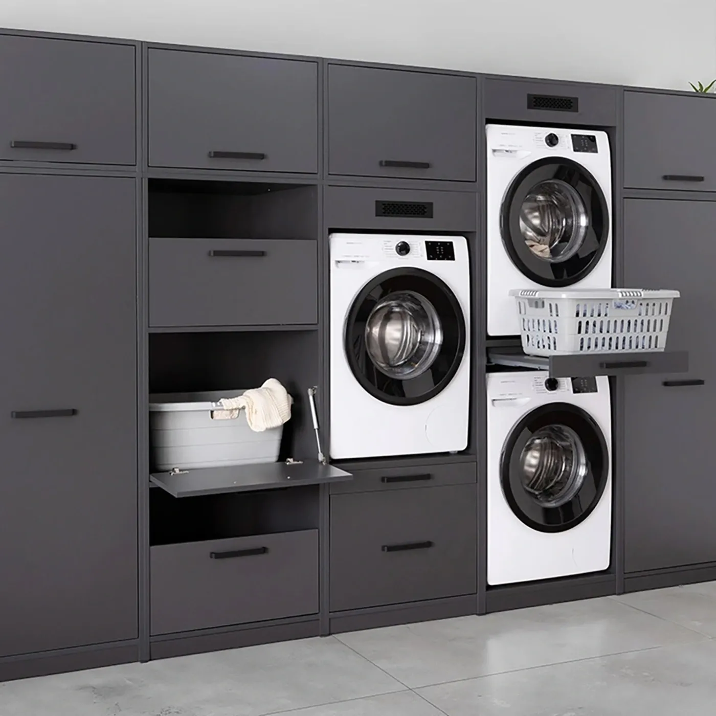 Composizione di mobili porta lavatrice e contenitori per la lavanderia.