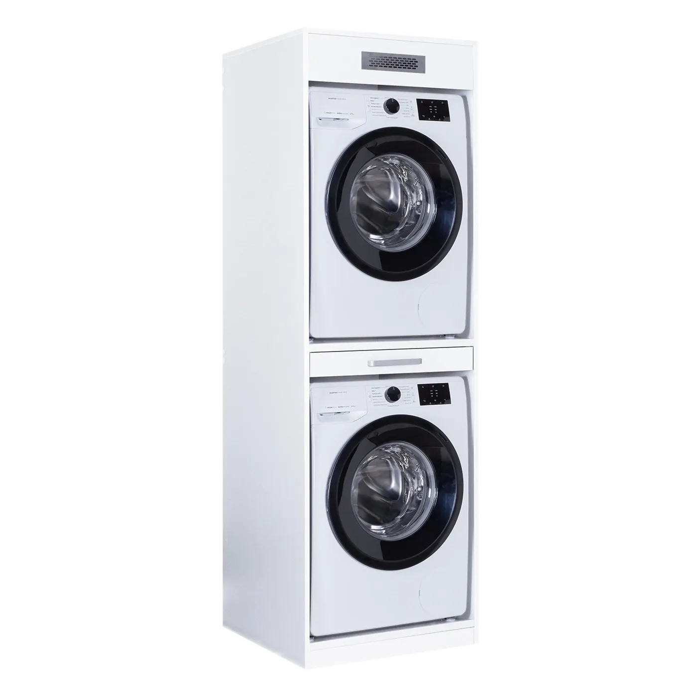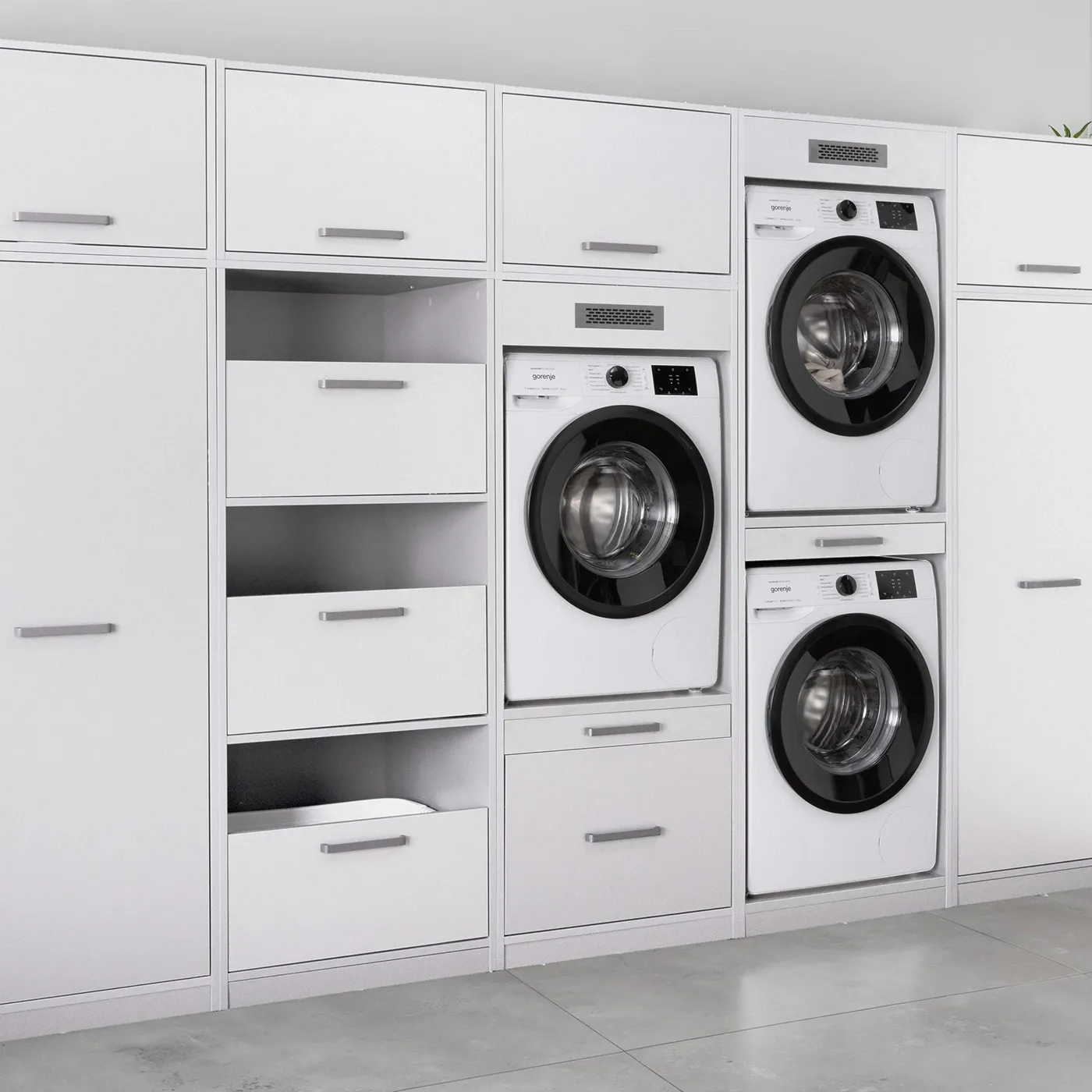 Composizione di 2 mobili porta lavatrice, 2 armadietti e cassettiera, L.335 H.208 P.68, Bianco