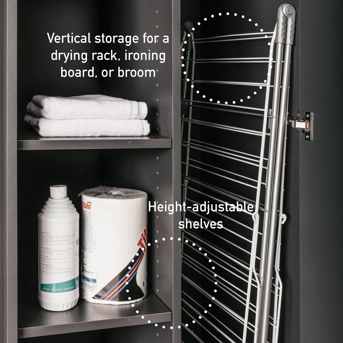 Mobile dotato di un'anta e di 3 ripiani contenitori per conservare detersivi, asciugamani e altri strumenti utili alla pulizia della casa. Ideale per essere posto all'interno di una lavanderia.