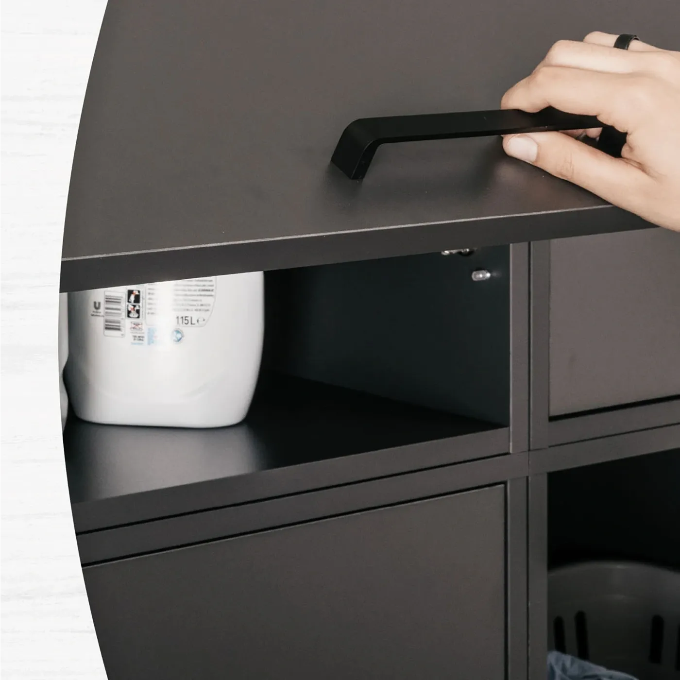 L'articolo è dotato di un'anta a ribalta con chiusura soft close e di 3 ampi vani contenitori di cui 2 a giorno, ideale per contenere oggetti come asciugamani, detersivi o altri strumenti per la pulizia. Le maniglie sono in alluminio.