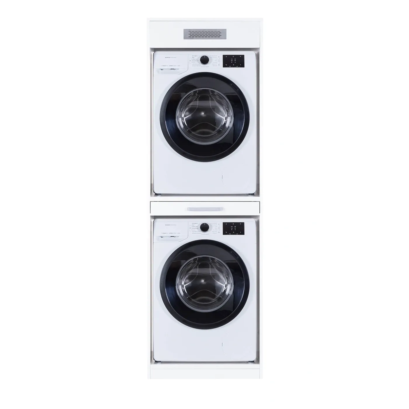 Mobile porta lavatrice e dotato di 1 cassetto estraibile che può fungere da top per appoggiarvi un cesto porta biancheria e di 2 vani per lavatrici. Ideale per essere posto all'interno di una lavanderia.