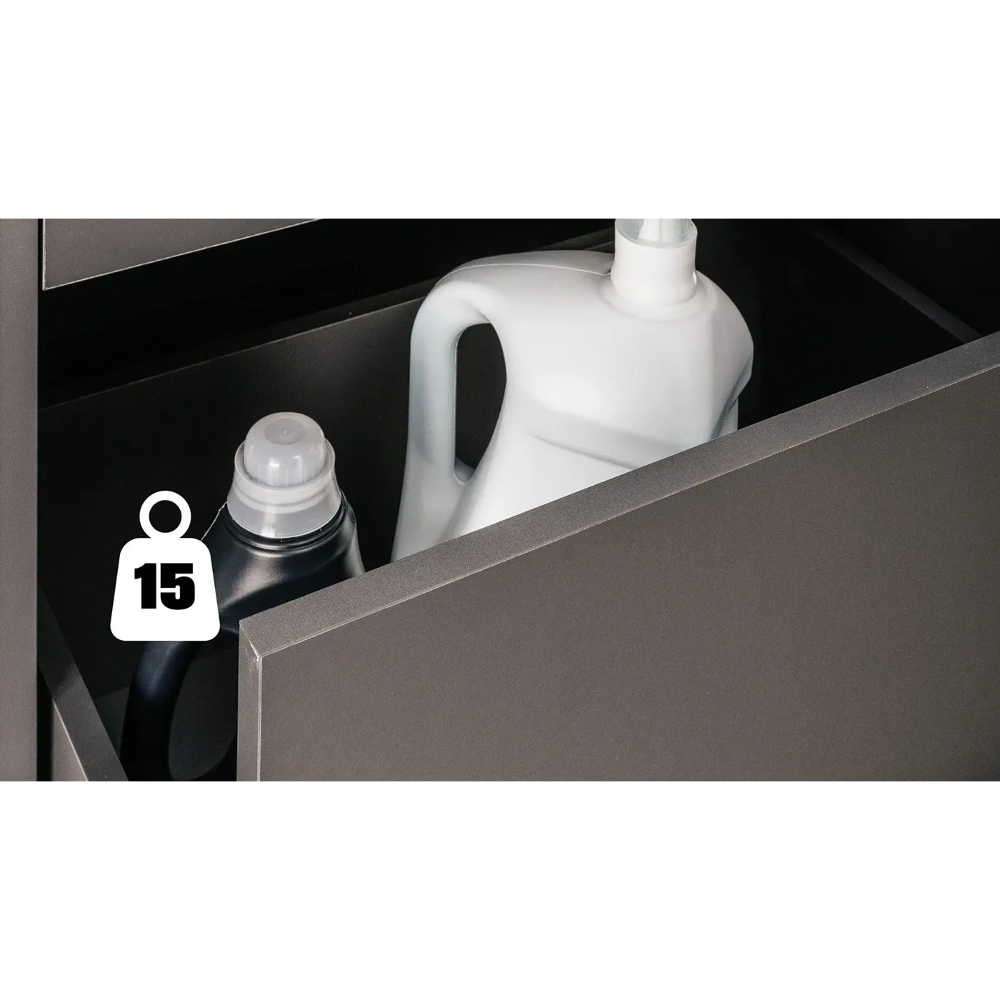 L'articolo è dotato di 2 cassetti, il primo più piccolo e costituente un piano estraibile per potervi appoggiare ad esempio un cesto porta biancheria (massima portata 10 Kg) mentre il secondo costituisce un cassettone estraibile (massima portata 15 Kg) con chiusura soft close per contenere oggetti come asciugamani detersivi o altri strumenti per la pulizia.