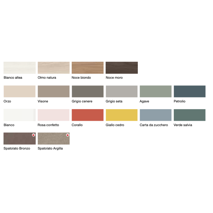Le finiture proposte sono Olmo natura e Giallo cedro: grazie ad un’ampia gamma di colori è possibile personalizzarlo per adattare il pannello attrezzato a qualunque contesto.