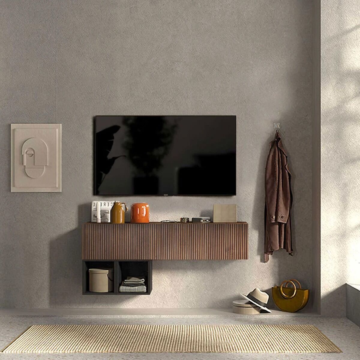 A caratterizzare la parete attrezzata è la nuova finitura cannettata mercure posta nel frontale, che dona armonia e movimento alla stanza.
