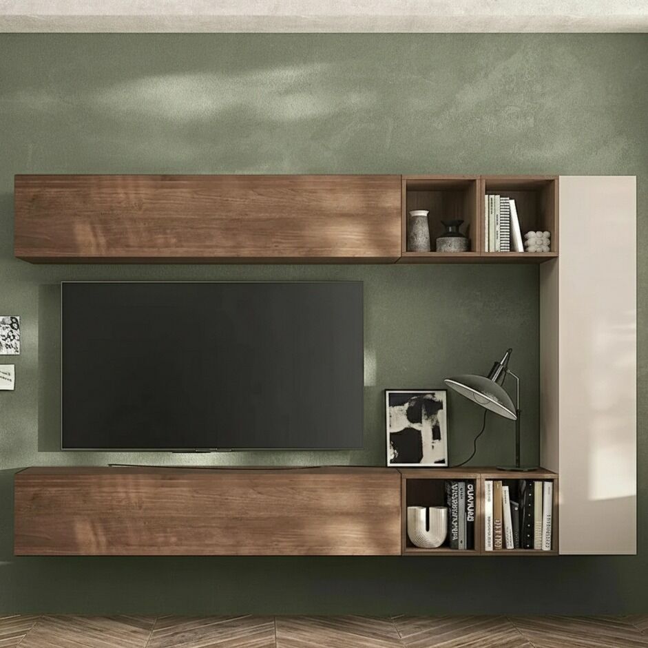 La sospensione dei moduli inferiori e l'uso di linee pulite contribuiscono a un senso di leggerezza e modernità, al contempo, il contrasto tra il Cashmere e il Mercure di alcuni elementi conferisce profondità e carattere, rendendo questa parete il punto focale elegante di un soggiorno moderno.