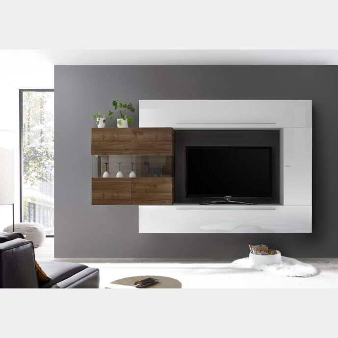 Parete attrezzata con vetrina 2 ante, finitura Bianco Lucido e Noce Dark