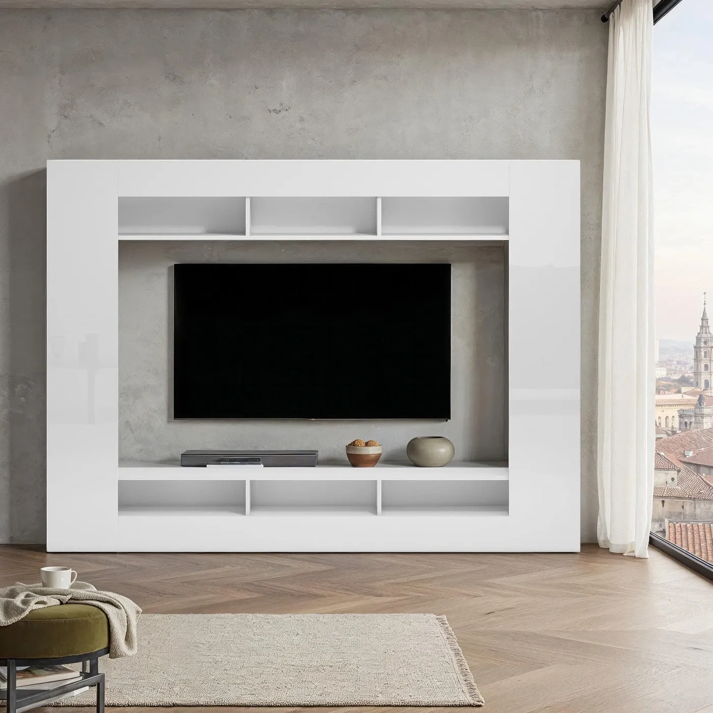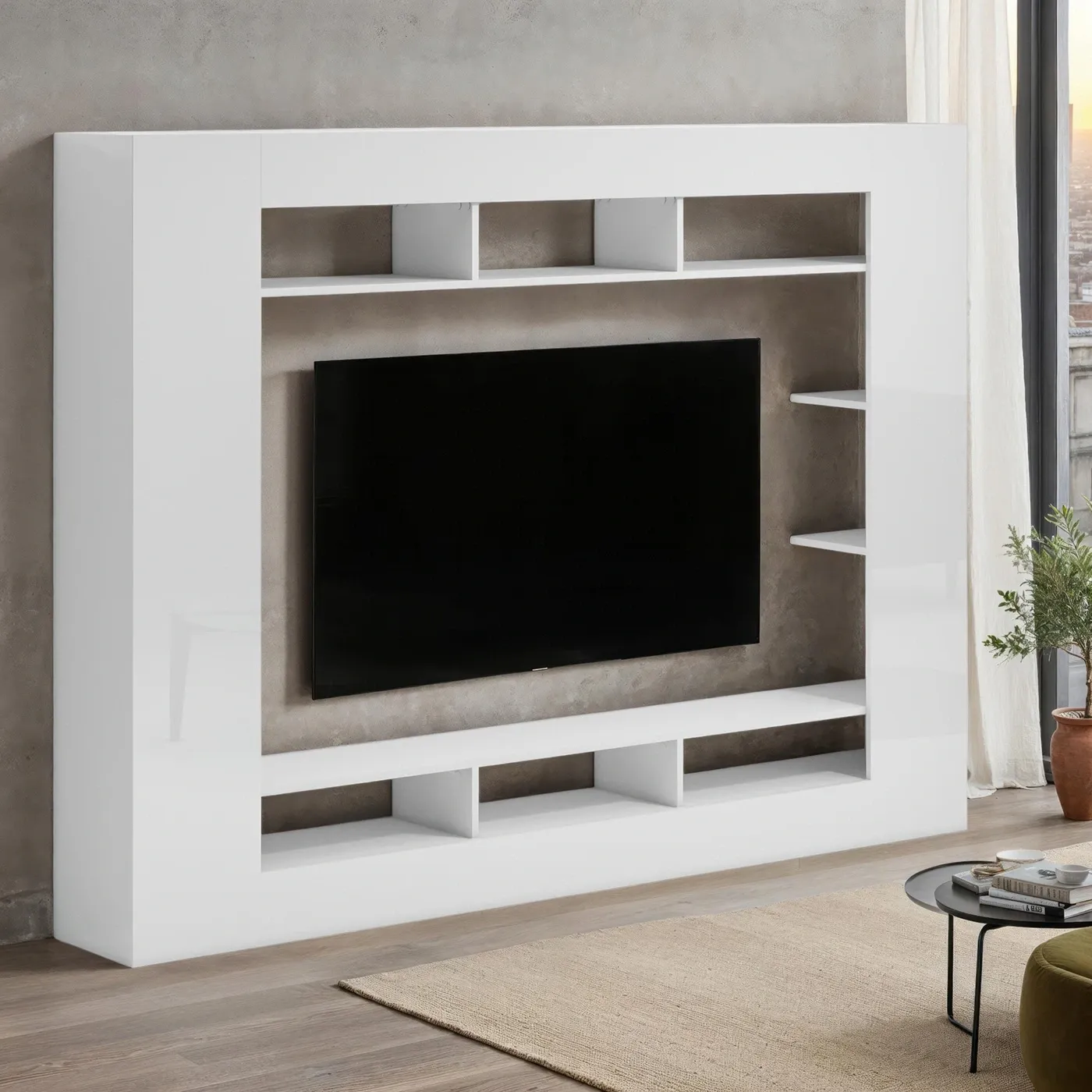La parete si presta perfettamente al contenimento e all'esposizione di libri, soprammobili di design, consolle da gaming o altri elettrodomestici.