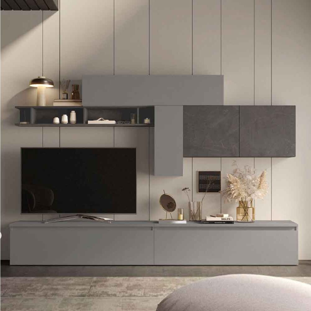 La Parete attrezzata finitura Ardesia e Piombo è una composizione interamente moderna caratterizzata da linee geometriche e innovative, si adatta a tutti gli ambienti per offrire alla tua zona living un tocco di tendenza.